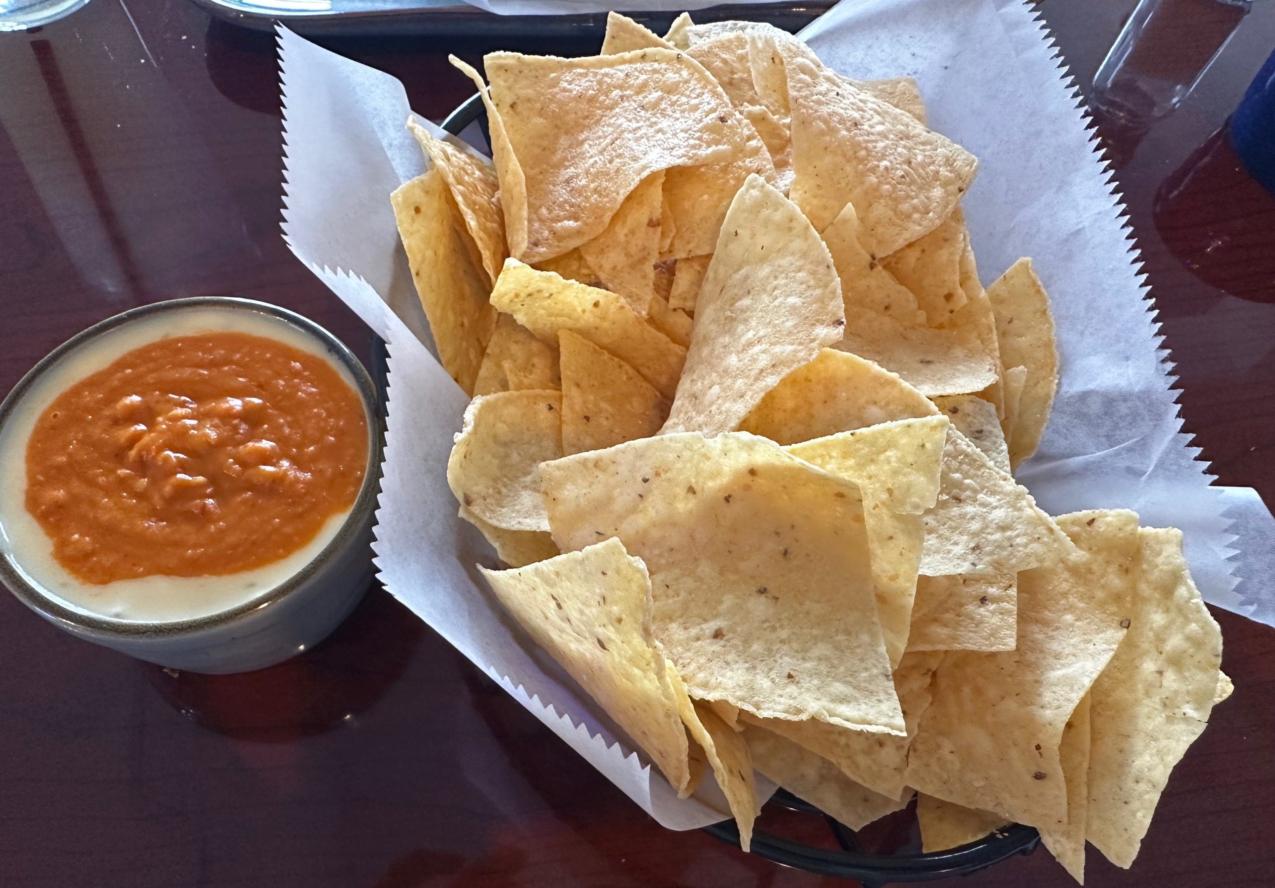 11 November 2024: Even though my Kim dislikes pinto beans (even after living in New Mexico for 26 years), she loves bean dip made from refried dip usually with shredded cheese on top. Fiesta Azul offers a bean and queso dip, essentially reddish refried beans foming an island in a lagoon of melted queso. The redishness of the beans comes from paprika which also lends just a hint of piquancy. Just a hint, mind you, but too much for my Kim. I’ve long ago stopped feeling sorry for her inability to tolerate piquant foods because it means I can eat them all.