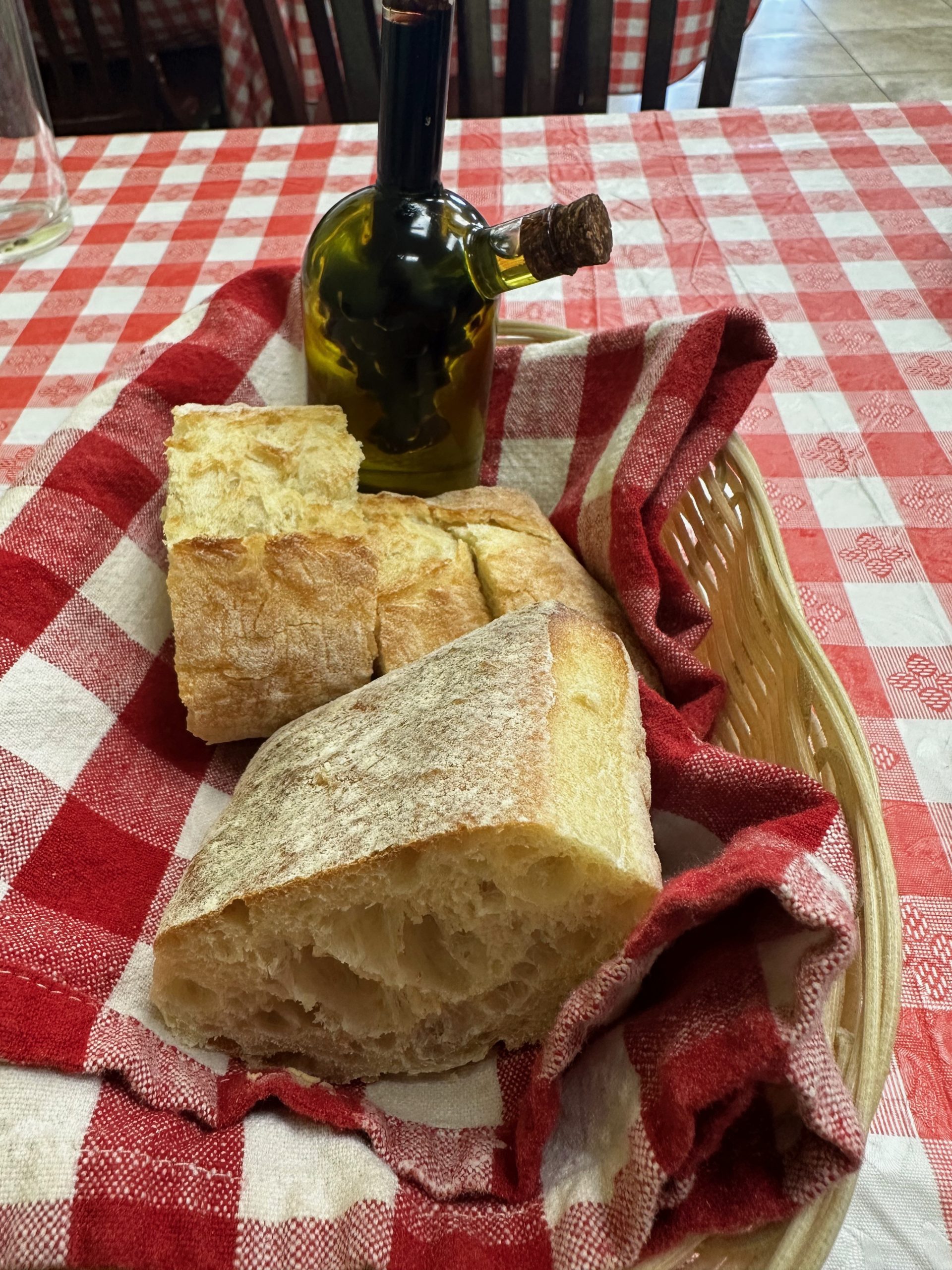 3 January 2025: As we waited for our meal to be delivered, Francesca ferried over a basket of Italian bread. On our table was a glass oil and vinegar cruet with an inner chamber designed to hold vinegar and an outer chamber holding olive oil. Access to both in one convenient container is genius. My Kim decided such a cruet is what she wants for her birthday so maybe this year I won’t be such a bad gift-giver. Such a cruet deserves a bread worthy of high-quality balsamic vinegar and olive oil. Dolce Vita’s bread is outstanding! Simultaneously airy and dense, the bread has wonderful absorbing qualities. It probably would have worked well with butter, too.