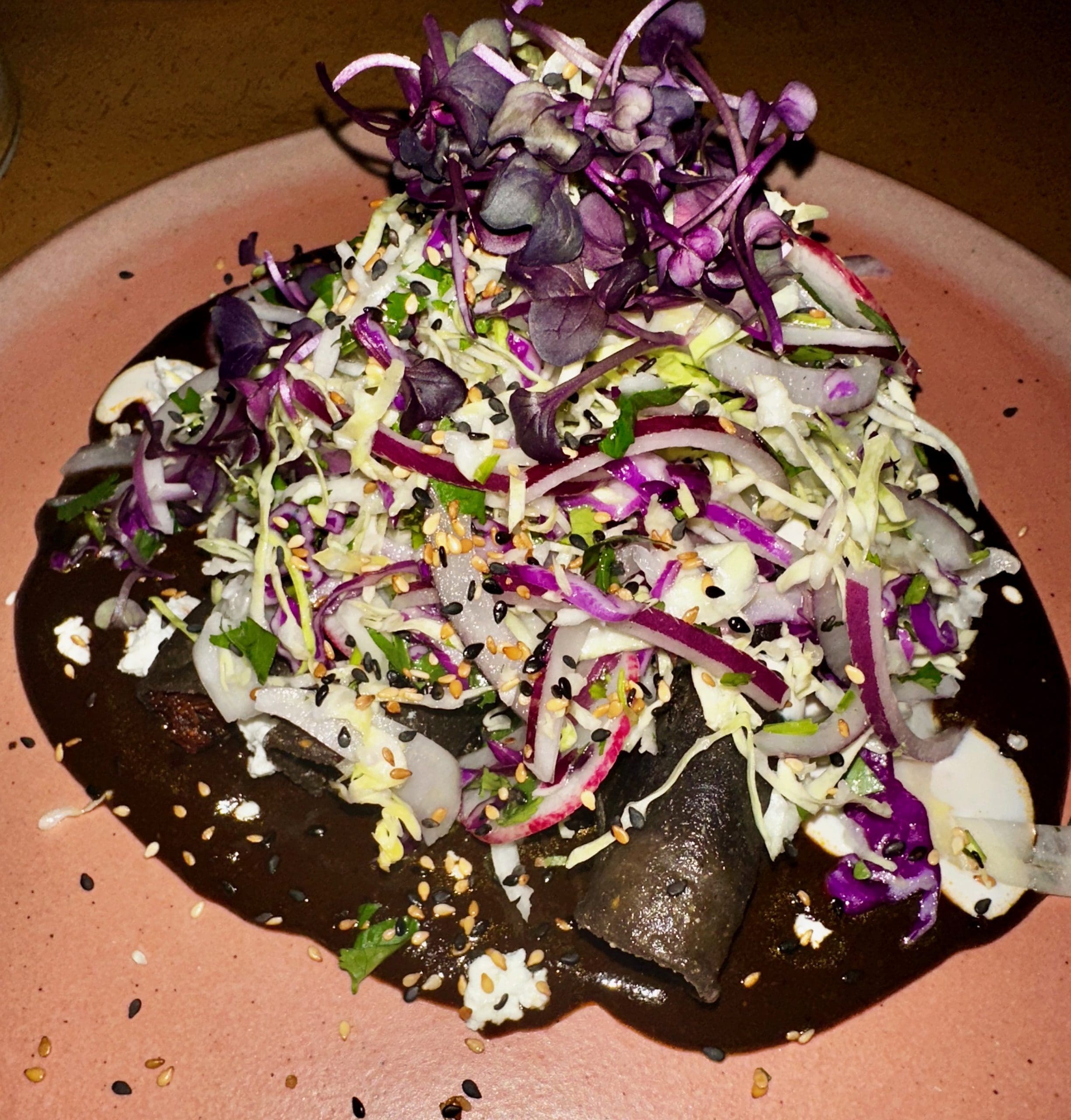 BEST BET: Horchata Semifreddo With Cajeta, Quesa Birria Tacos, Mole De La Casa, Crushed Pepinos, Plantains and Refried Beans Covered With Crema and Sprinkled With Zatair