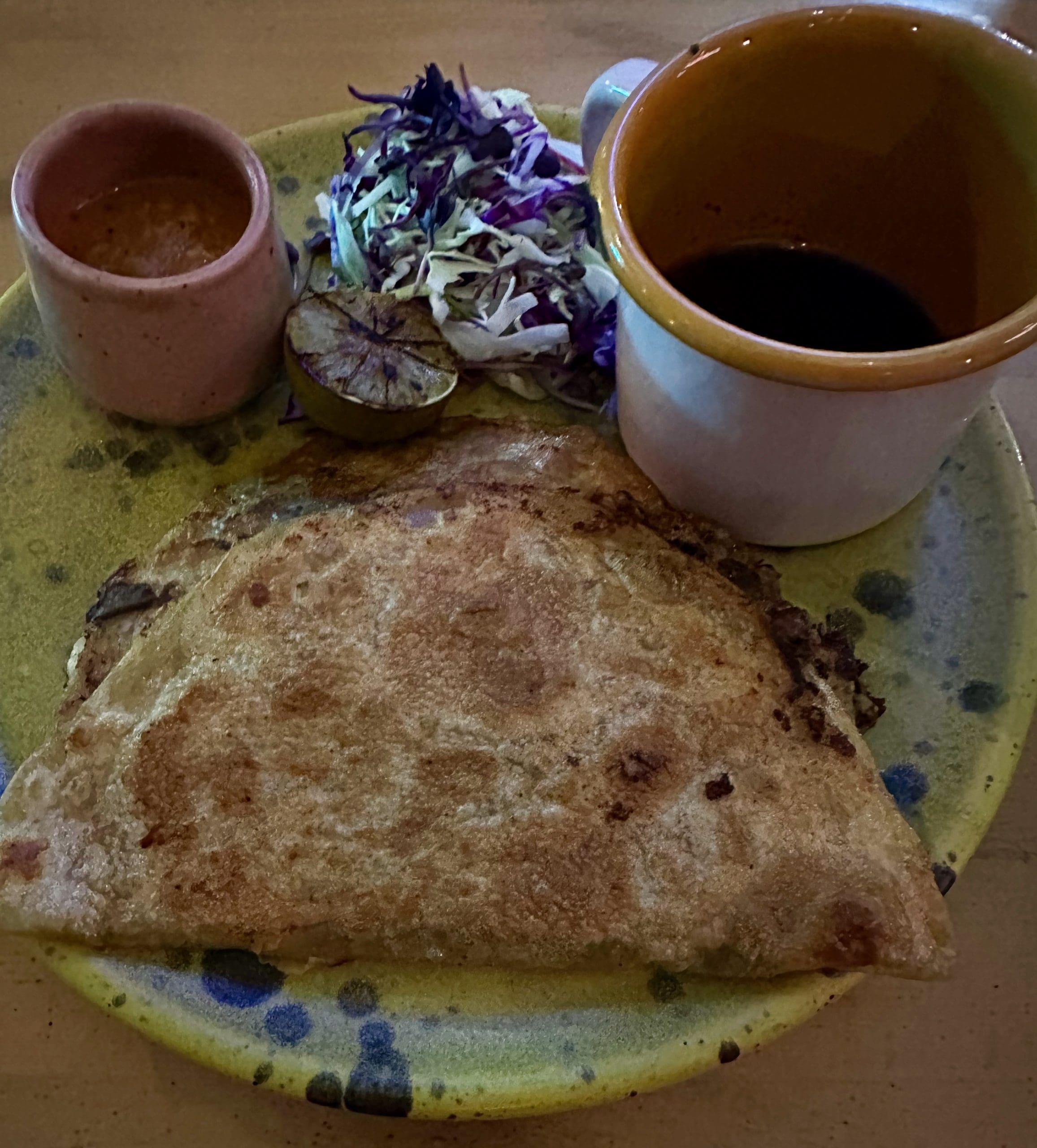 In New Mexico, I can’t get my Kim to even try quesa birria tacos. Our server’s assurance that these quesa birria tacos ( (Benny Blanco flour tortillas, queso, onions, cabbage with miso consomme and salsa guero on the side) didn’t bite back was reason enough for her to order them. To our mutual surprise, she enjoyed them very much. Full-sized flour tortillas made these some of the largest tacos we’ve had. Full-sized flavor to match their size made them among the very best. The consomme was a bit on the salty side and the salsa guero was fairly mild, but my Kim didn’t use either.
