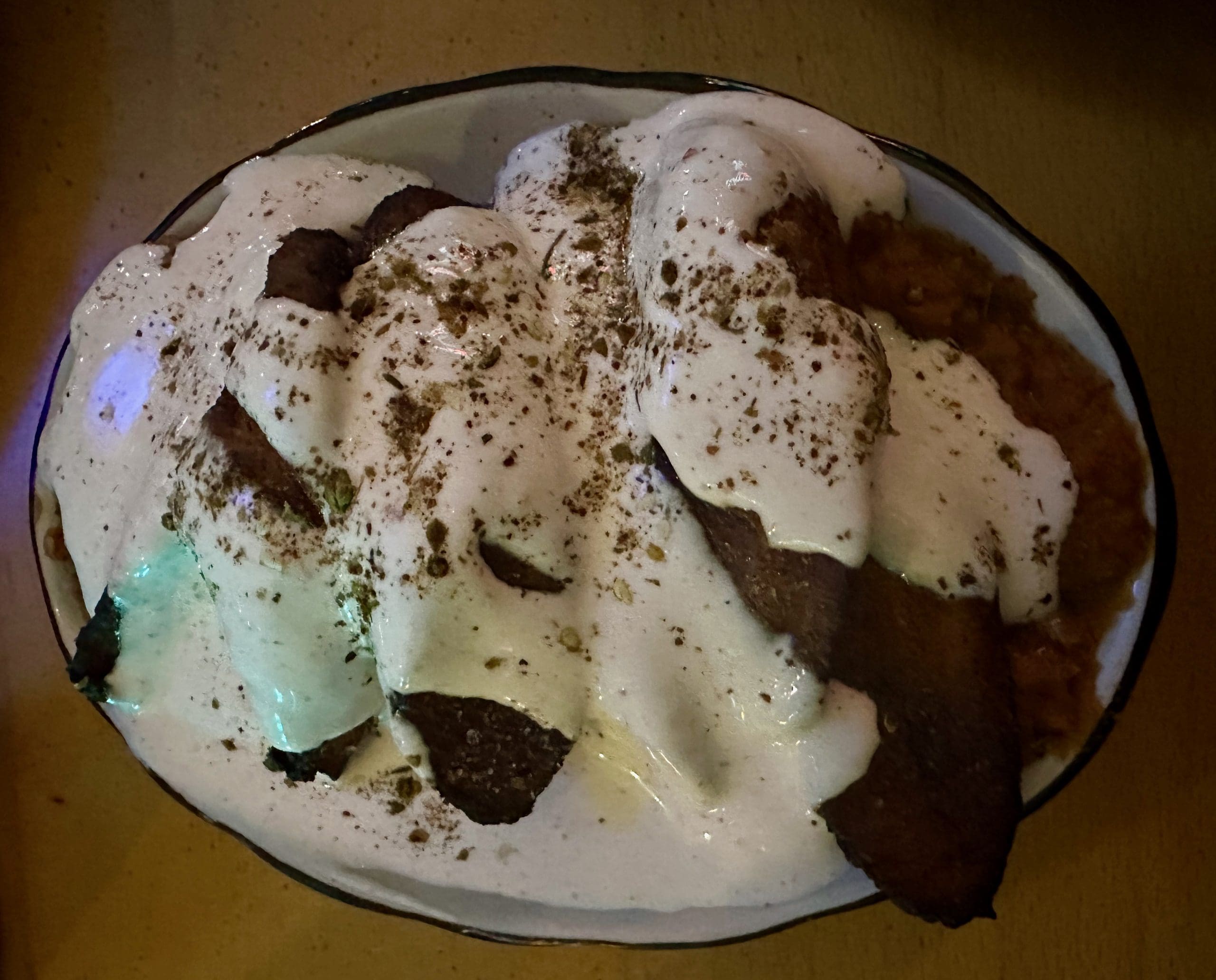 I’ll give my Kim credit, she doesn’t dislike beans (a mortal sin for native New Mexicans) as much as she dislikes piquant foods. So, it surprised me when she acquiesed to an antojito (small plate) made with refried charro beans, crema, maduros (fried sweet plantains) and a light sprinkle of za’atar. Predictably she enjoyed the maduros and creama most, leaving the refried charro beans for me. Za’atar, a spice blend composed of herbs such as thyme, oregano, marjoram or a combination of the three, along with other spices including sesame, sumac, cumin or coriander, is a surprising addition that lends just a little punch to this amalgam. The sweet maduros were especially good, but combining every flavor profile into each bite was best.
