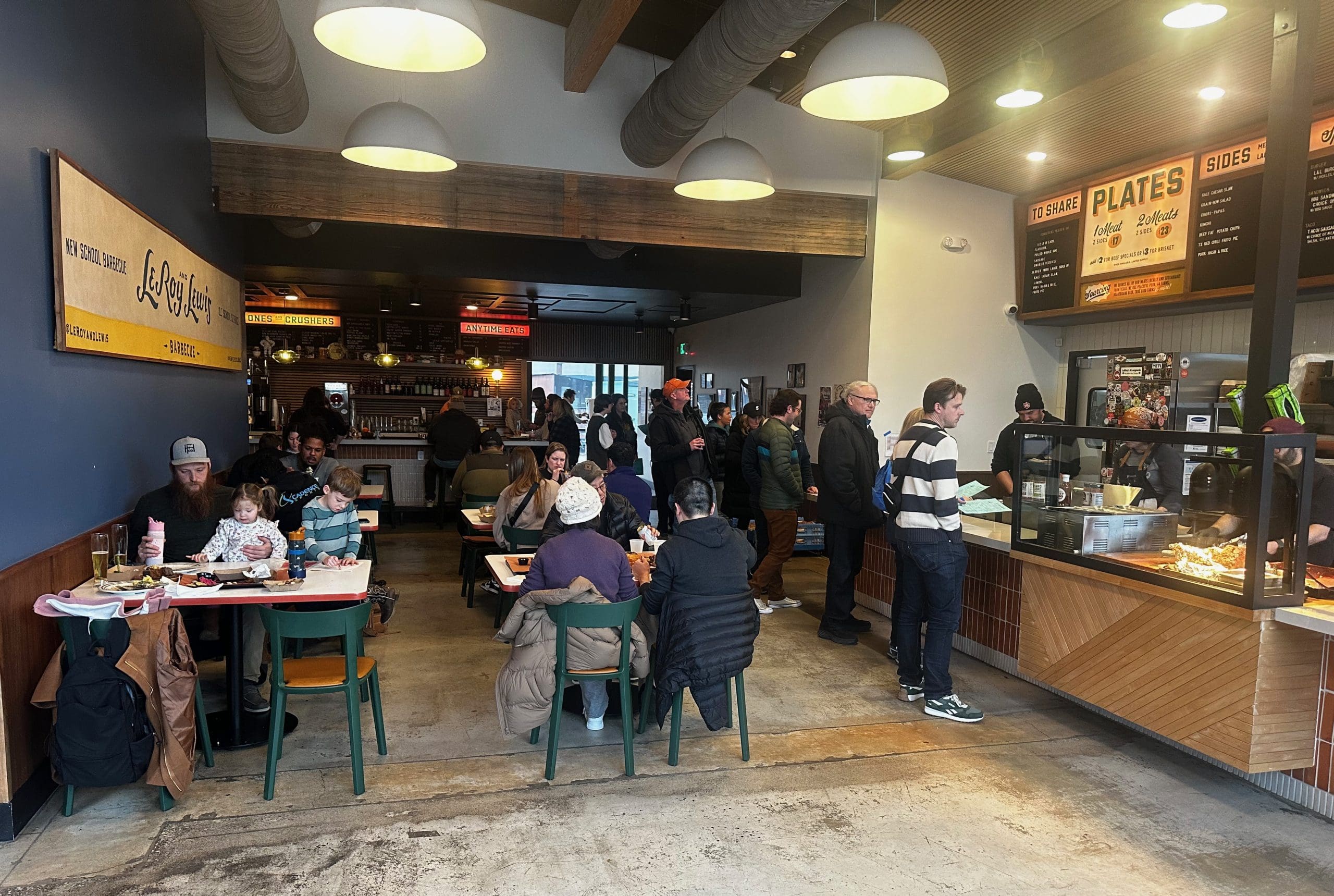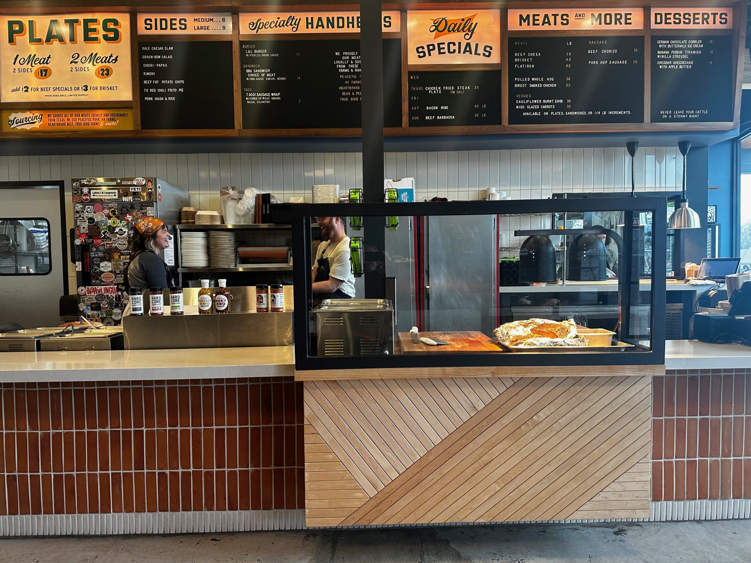 Vaughn noted that “The joint’s ethos is aptly summed up in its slogan: “New School BBQ, Old School Service.” At LeRoy and Lewis, the new-school approach means Evan LeRoy eschews pork ribs (though on Saturdays he does offer “bacon ribs”—massive pork ribs with the belly still attached) and turkey (except around Thanksgiving) and serves brisket only on Saturdays and Sundays. (Said brisket is Akaushi, by the way, and a good reason for a weekend visit.) Seven years after debuting its popular trailer, LeRoy and Lewis launched its 5,000 square-foot brick-and-mortar in South Austin on February 28, 2023. With more commodious digs to operate from, brisket is now an everyday offering. LeRoy and Lewis is a “whole animal barbecue restaurant,” that includes lesser-used cuts as well as beef cheeks.