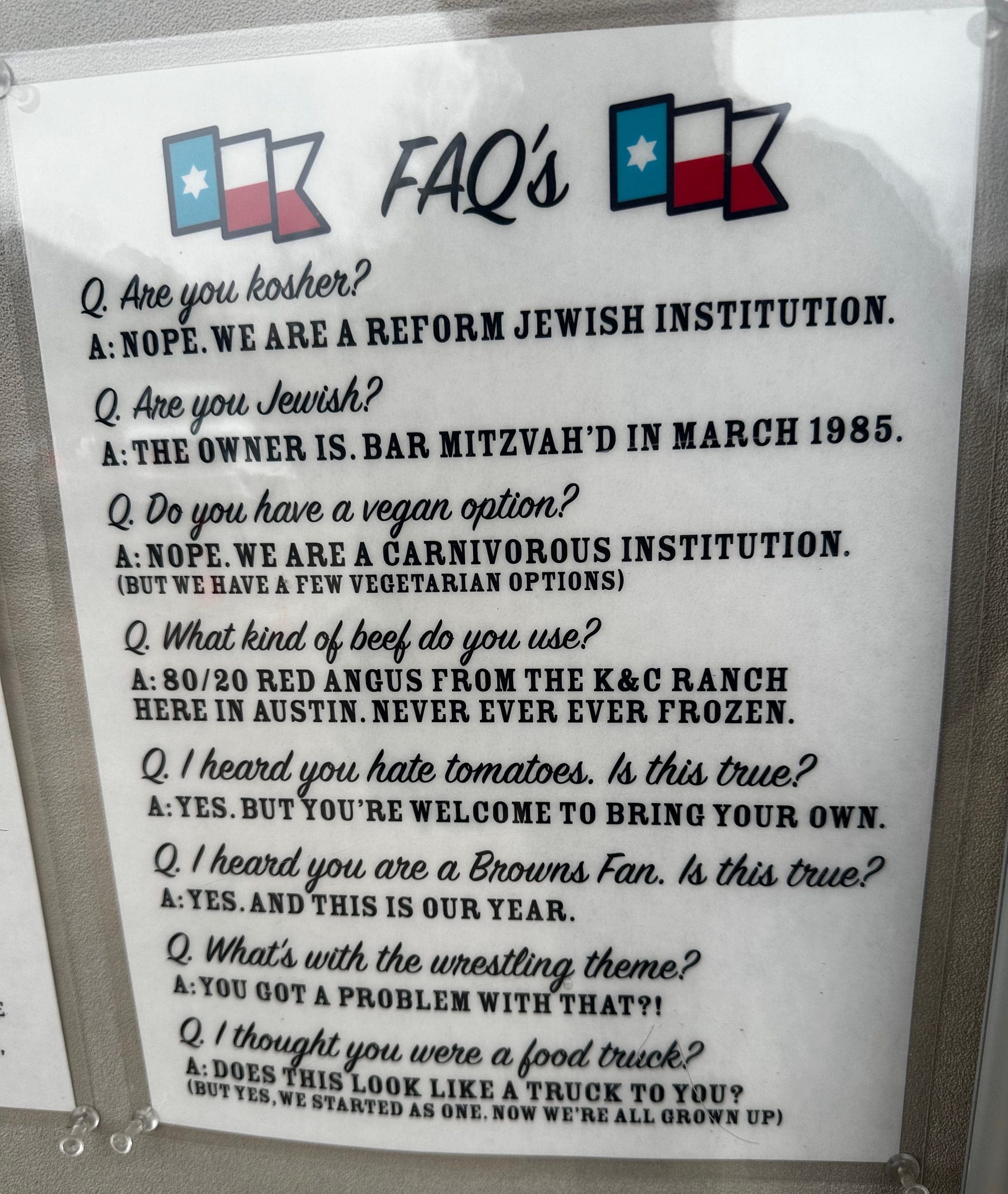 Honestly, I wasn’t planning on visiting a burger joint during my jaunt to Austin. Then Jan from the delightful “All About The Flavors” Instagram site messaged me: “You owe it to yourself to visit @jewboy burgers. You’ll be glad.” She later added “They’re delicious and the guy who runs it is a mensch. You’re going to love it.” That evening I asked the hostess at Nixta Taqueria about the burger joint with the quirky name. With the alacrity and enthusiasm of a real fan, she told me JewBoy was her favorite burger joint. I asked her if the liberal-leaning Austinites found the name offensive. She said the restaurant is especially beloved by students at the nearby University of Texas. They recognize that owner Mo Pittle is poking fun at himself. He equates “Jewboy” to “homeboy,” a common colloquialism among the Hispanic kids with whom he grew up in El Paso.
