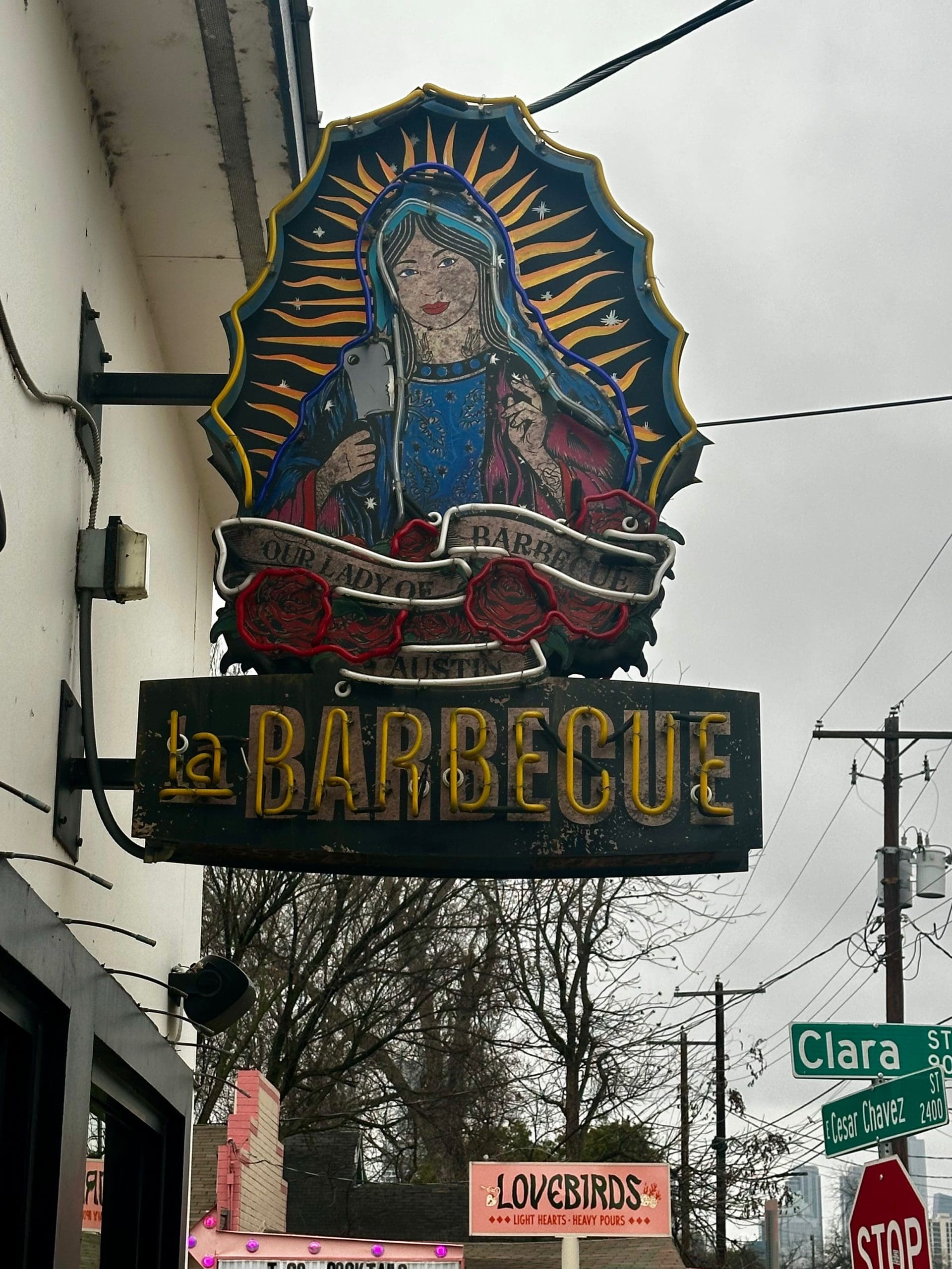 While in line, you can’t help but notice the most controversial aspect of La Barbecue. A neon sign displays a brazen image of a woman bearing a remarkable semblance to the Virgin Mary. This version depicts a heavily tatted Blessed Mother holding a meat cleaver in her right hand. Texas Monthly’s Barbecue Editor Daniel Vaughn opines: “A passerby might wonder if it’s the entrance to a hipster Catholic church—until they see “Our Lady of Barbecue” printed beneath it.” In a city where a burger joint named “JewBoy” doesn’t raise anyone’s hackles, few seem to consider the imagery sacreligious. Maybe that’s all part of Austin’s weirdness.