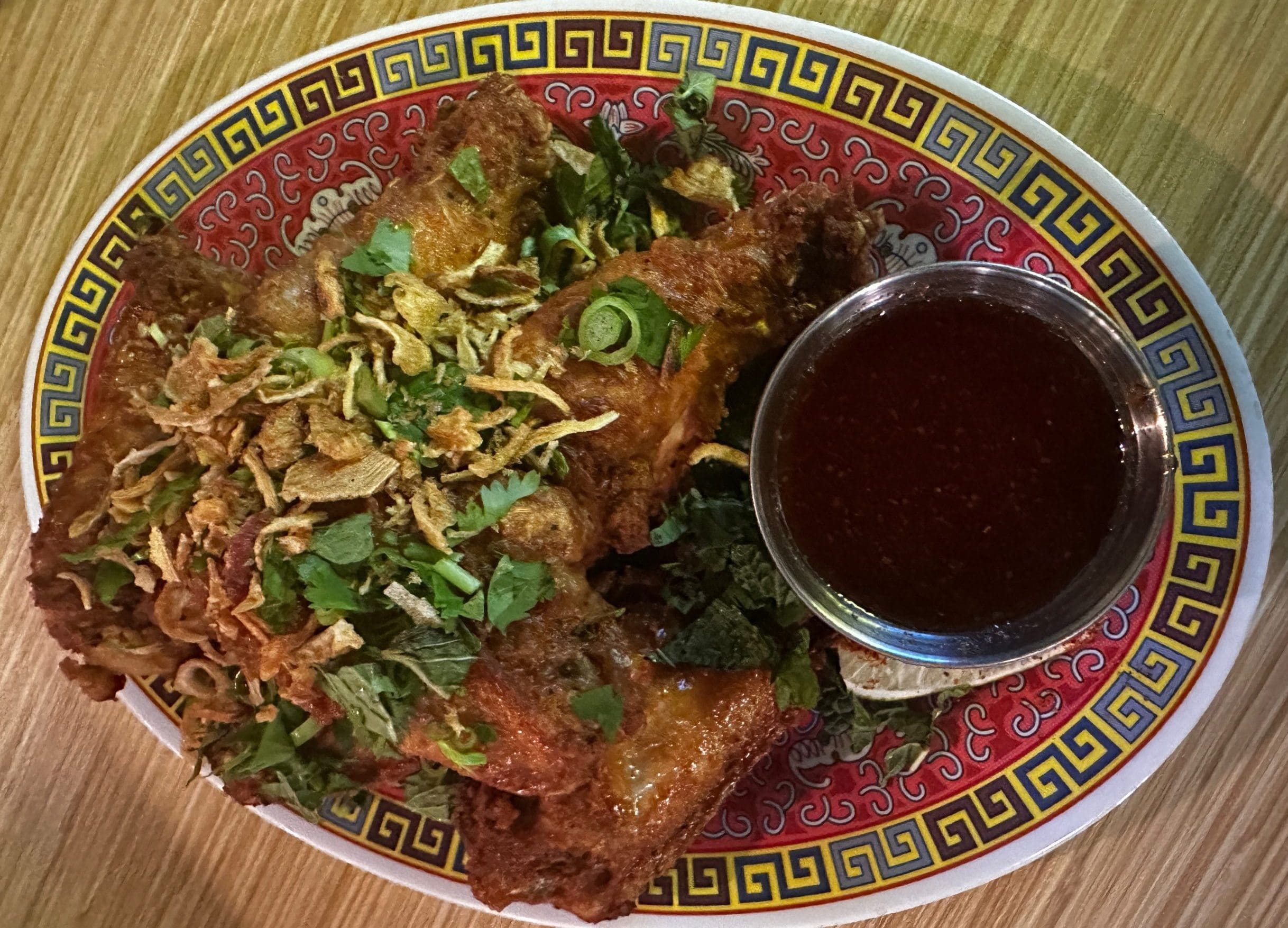 A December, 2024 visit to Glai Ban followed by a January, 2025 visit to Tambayan Filipino Food, both in Phoenix, reenforced a conclusion at which we’d already arrived. That conclusion is that satay, a Thai restaurant standard may just be “desiccated corpse meat,” a term my friend Carlos coined for the thin strips of meat (usually pork or chicken) skewered onto wooden sticks. We arrived at our conclusion after one too many disappointing servings of satay. Both Glai Ban and Tambayan serve grilled beef skewers that kick sand on the 98-pound weakling that is satay. So do the grilled beef skewers (lemongrass marinated beef rib fingers, toasted rice powder, Jaew Som, pickled shallots and herb medley) at Ma Der. Look up the definition of “meat candy” and these delicious skewers might just show up. They’re terrific: flavorful, moist, tender and absolutely wonderful