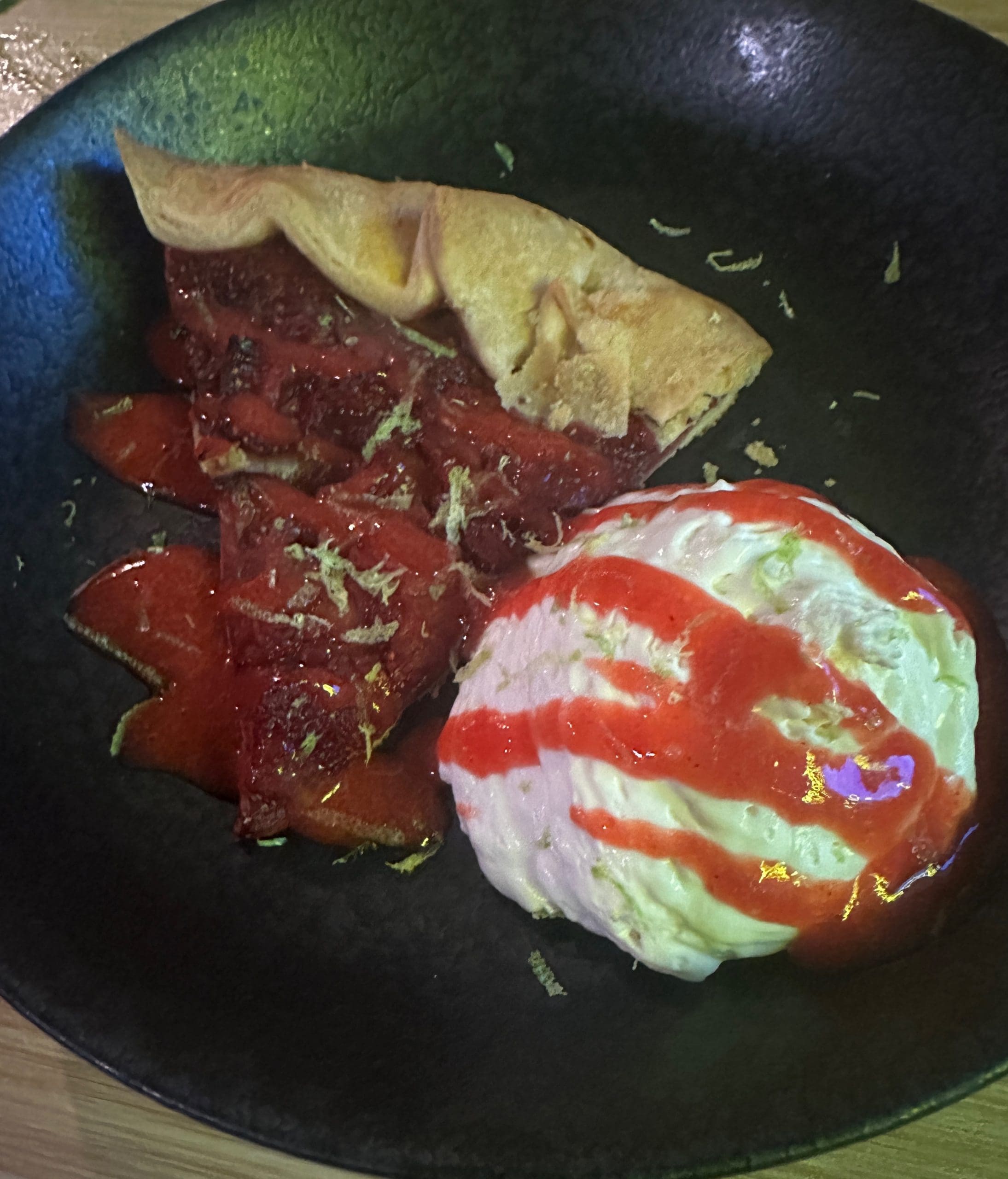 Ma Der’s menu offers two desserts. One is coconut soup (chilled coconut soup with jackfruit, palm seed, coconut jelly). The other is a rotating dessert which may contain gluten. We observed as the for businessmen in the table adjacent to ours all ordered the coconut soup. Most of them didn’t finish it, but we attributed that to the chicken coops of chicken they had eaten. Instead of the coconut soup, we had the strawberry galette with a strawberry coulis. The strawberries were tangy and plentiful; no filler here. The crust proved a perfect canvas for a dessert that exemplifies summer’s freshness.