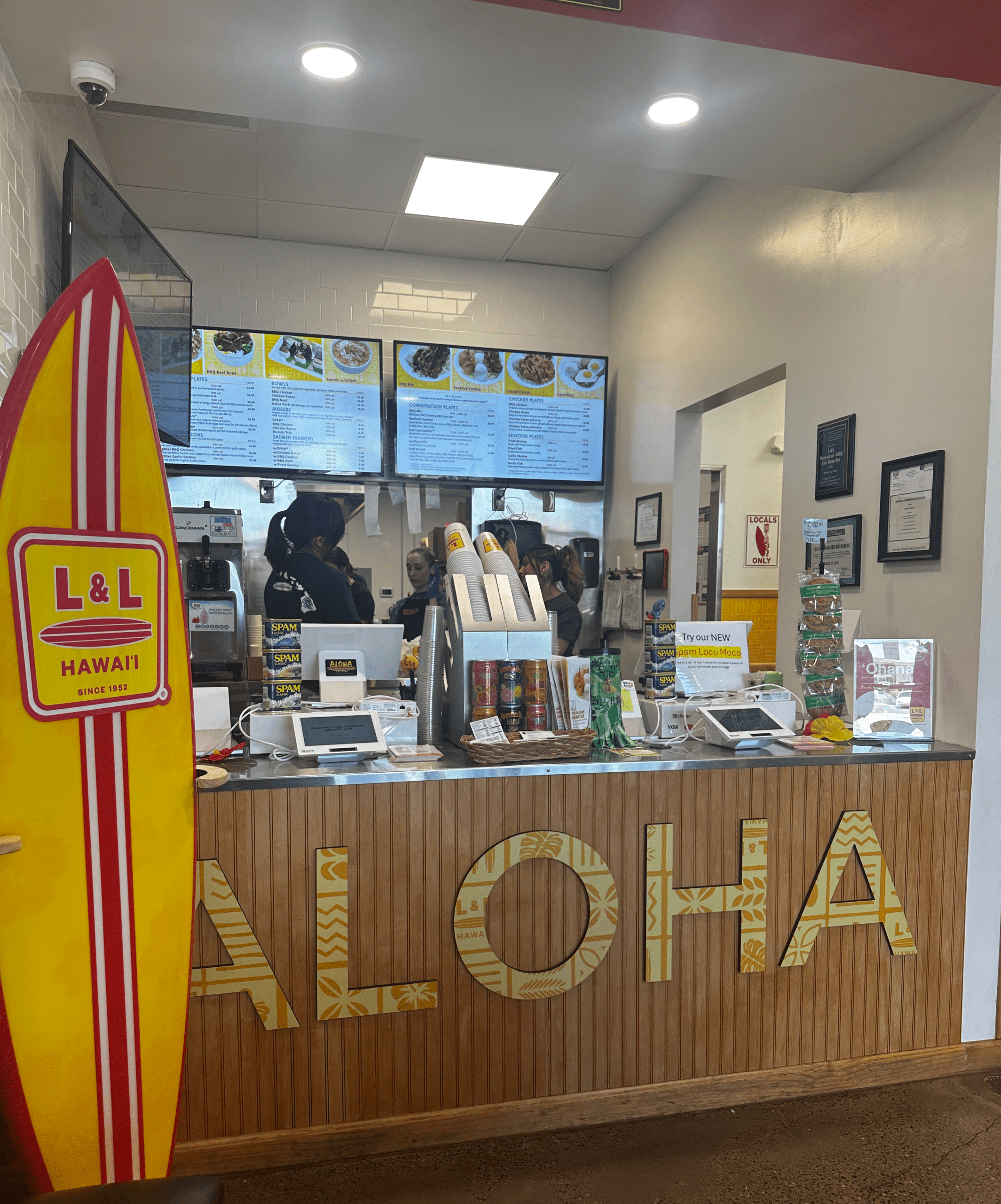 At L&L, cans of SPAM are more prevalent as a decorative touch (stacked on the counter where you place your order) than it is on the menu. In addition to the ubiquitous SPAM Musubi, SPAM is an available protein on Saimin (ramen). Green chile infused loco moco isn’t the only item on the menu sure to please Haole (a Hawaiian term for non-native Hawaiian or Polynesian people, often referring to white people.) There are several categories of entrees on the menu: Combination Plates, Beef & Pork Plates, Chicken Plates, Seafood Plates, Lighter Options, Bowls, Musubi, Saimin, Burgers & Sandwiches, and a menu for Keiki (kids). It’s no stretch to declare the menu has something for everyone.