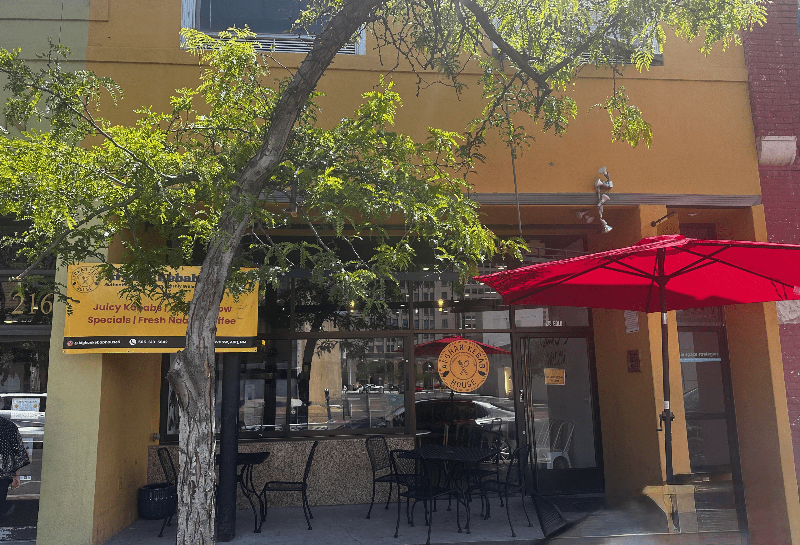 For many Duke City diners, the Afghan Kebab House has a familiar address (218 Gold Avenue, S.W.). Most recently, the golden-hued, two-story edifice which houses the Kebab House was home to the short-lived Knead Dough & Eatery. Among its other predecessors is the fabled Gold Street Cafe (and its legendary honey-glazed chile bacon). Signage on the building still reads “Gold Street Cafe” even though (as recently pointed out to me) it’s Gold Avenue, not Gold Street. Visit on a weekday and you’re less likely to find on-street parking and some of the parking lots are rather pricy.
