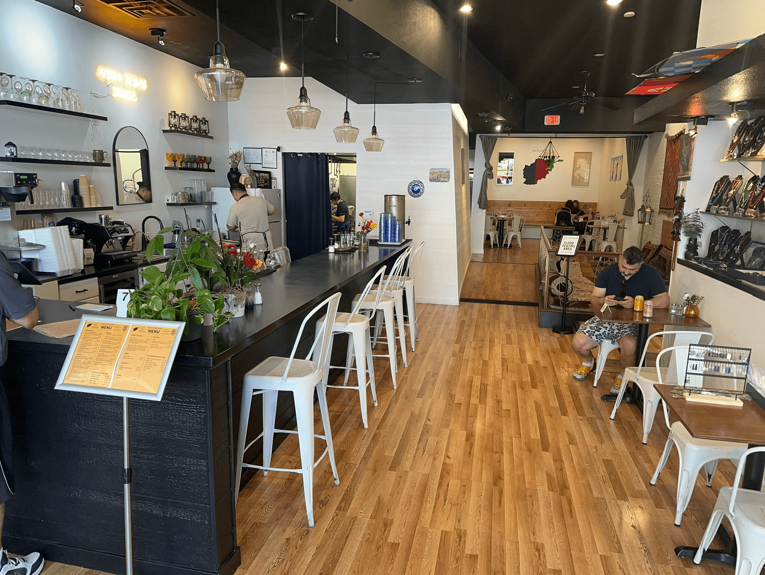 Much deeper than it is wide, the 2,600-square-foot restaurant seats up to 50 people with table seating, stool seating and even floor seating for those who want to enjoy their meal Afghani style: crisscross with shoes off. Seating is more functional than it is comfortable with metal chairs offering no padding. In addition to the aforementioned Afghan Girl portrait, the restaurant is festooned with art and decor reflecting Afghan culture. It is a bright and airy space made even warmer by the hospitality and friendliness of the Hussaini family. If you’re unfamiliar with Afghan cuisine, they’re happy to answer all your questions and provide recommendations.