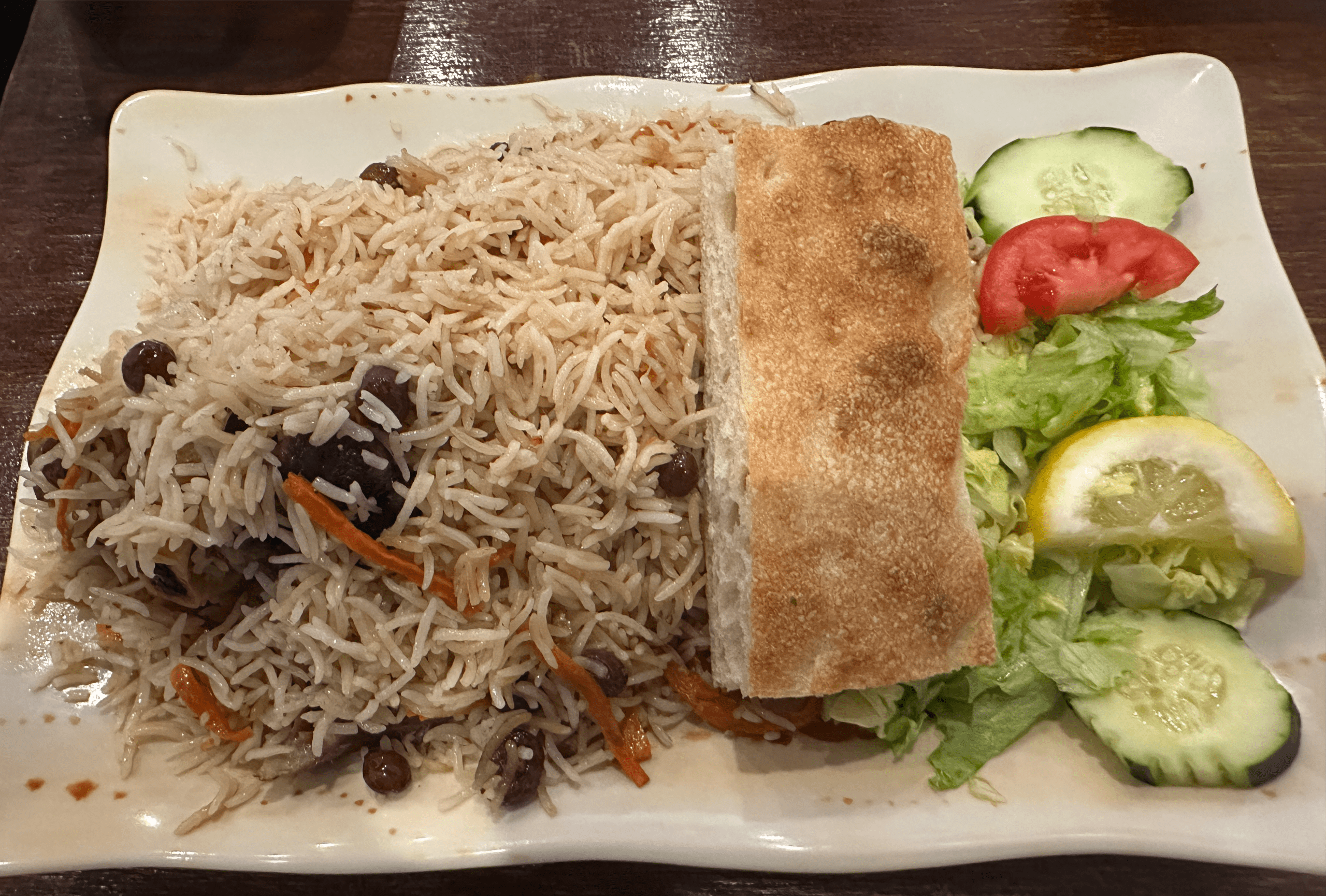 The Qabuli Palaw is described on the menu as “Afghan signature dish made with rice, lamb shank seasoned with spices. Topped with mixture of caramelized raisins and carrots. Served with Salad, Chutney and Naan.” Though mostly covered by rice, the lamb shank is roughly one pound and provides a significant portion of meat. While it might be tempting to devour the lamb shank by picking it up as you might a beef rib, it’s best if you use your fork to extricate some of the delicate lamb and enjoy it with the rice. It surprised us how much we enjoyed the caramelized raisins and carrots, the sweet notes lending personality to the rice. You might notice on the photo above is what appears to be a slice of focaccia. That, my friends, is actually Afghan naan. It’s quite good.