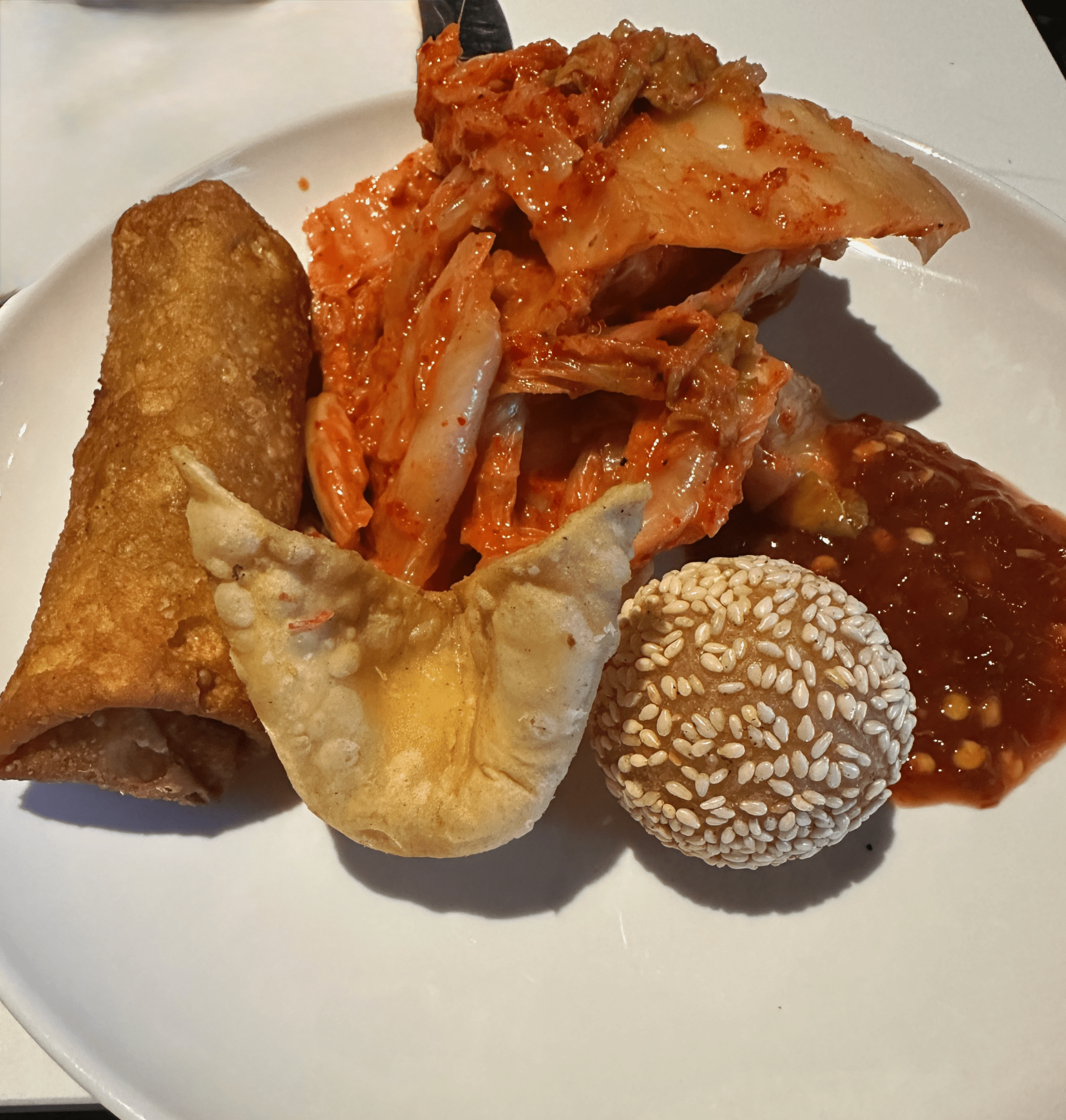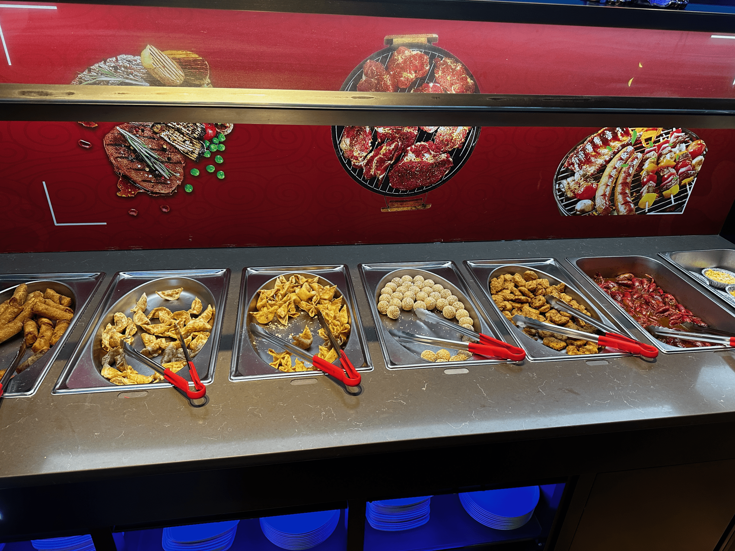 Self-service stations for sauces and sides were well-stocked, but without proper labels, it’s a crapshoot as to what you’re having. This is especially true of the sauces. My Kim had to ask a server which of the multitudinous sauces was “sweet and sour.” She was directed to a ponzu sauce which did the trick for her. For me, the spicy chili sauce was a dream fulfilled. It had plenty of bite and personality. Even better was the kimchi, a fiery cabbage dish not for the mild of taste buds. Among the sides are egg rolls, crawfish, sesame balls, dumplings and so much more. If only they were labeled….