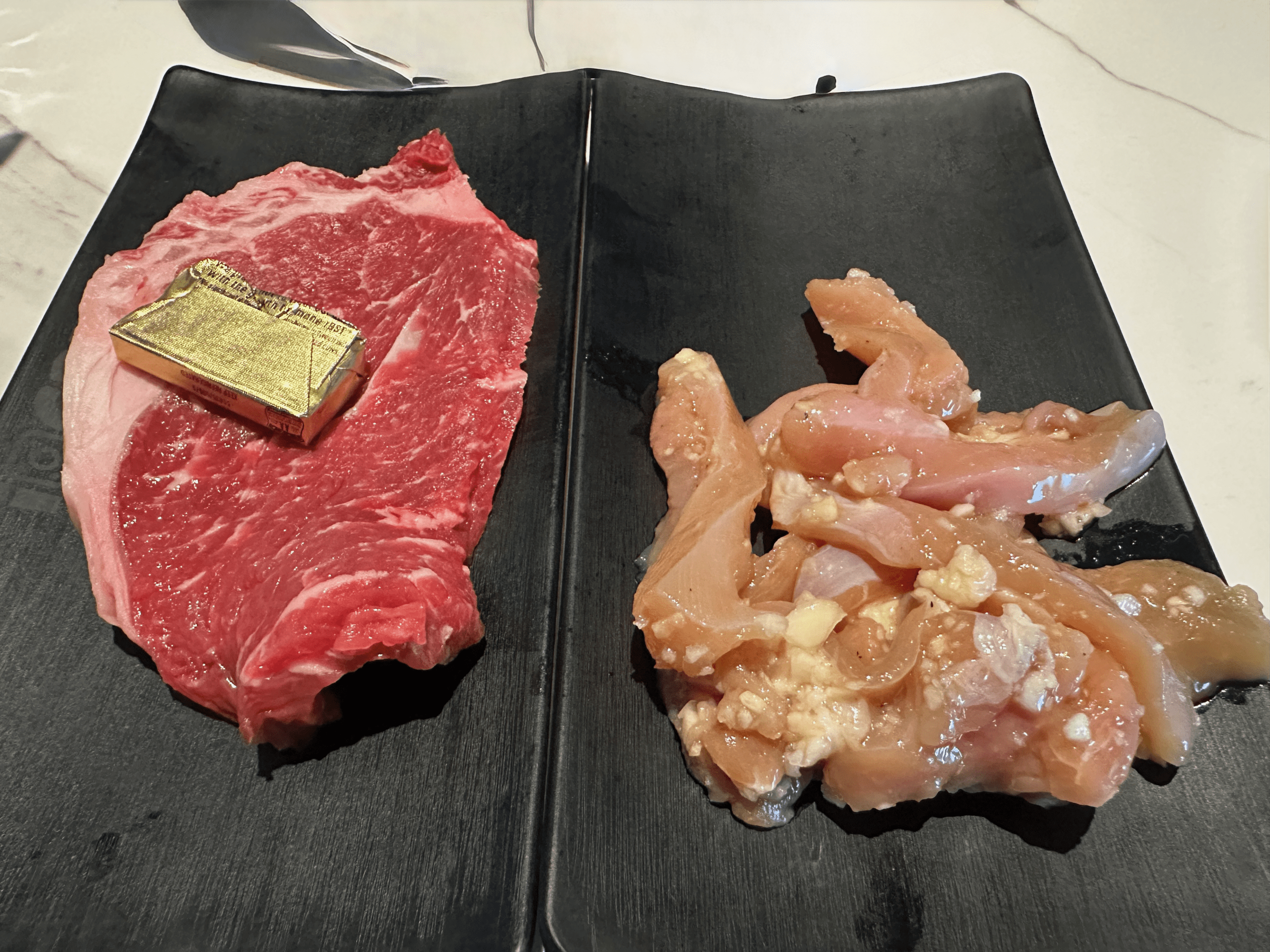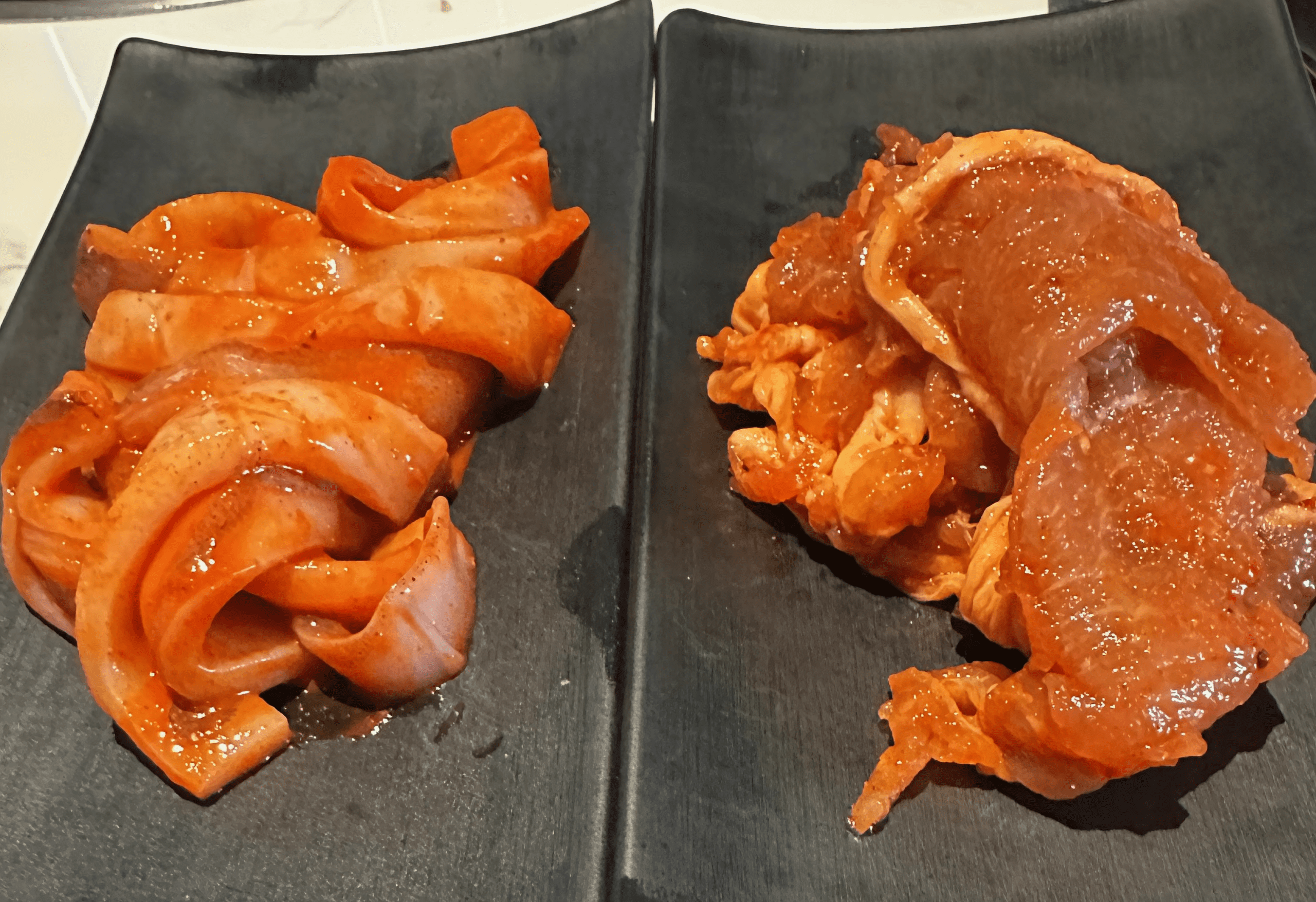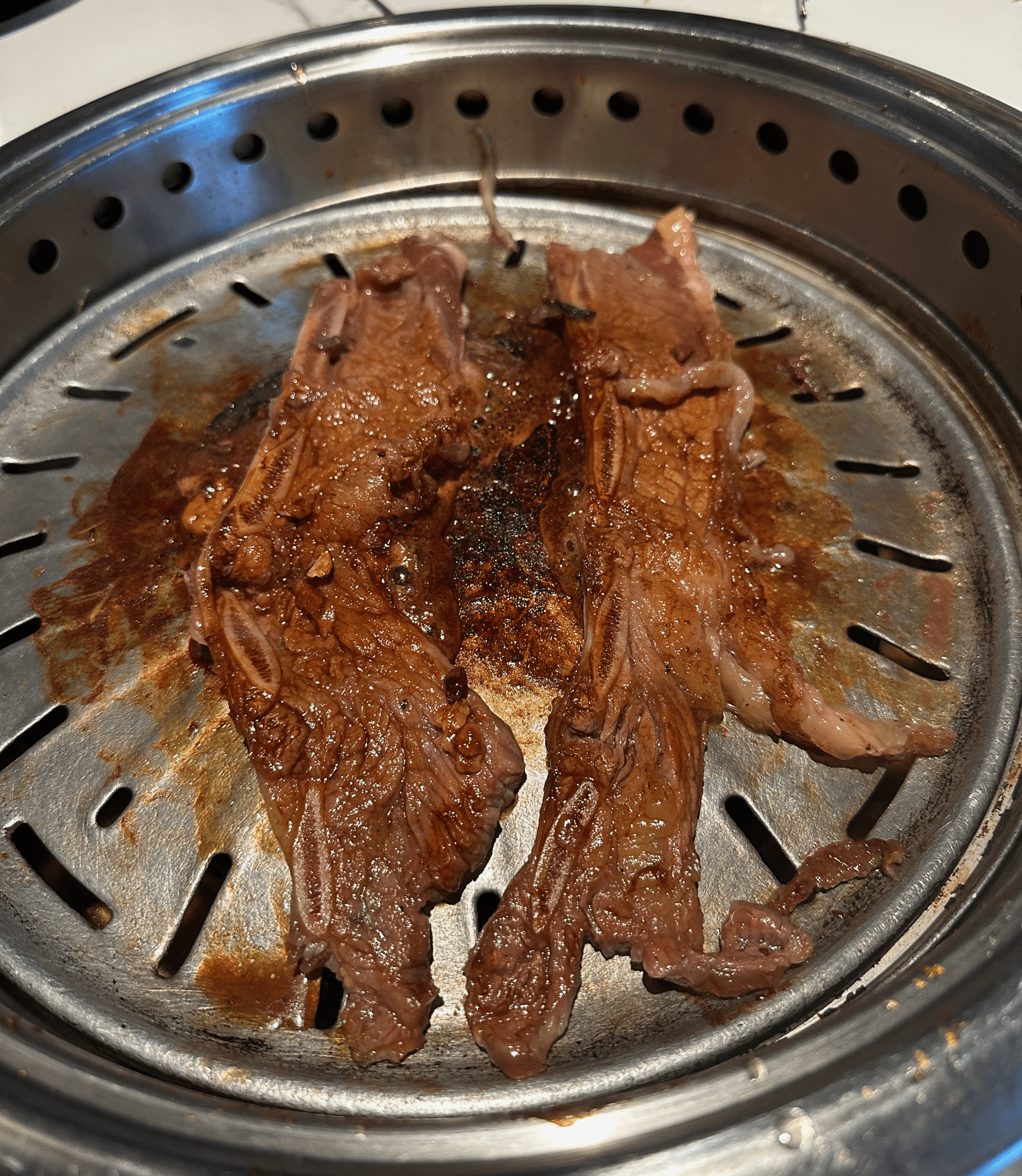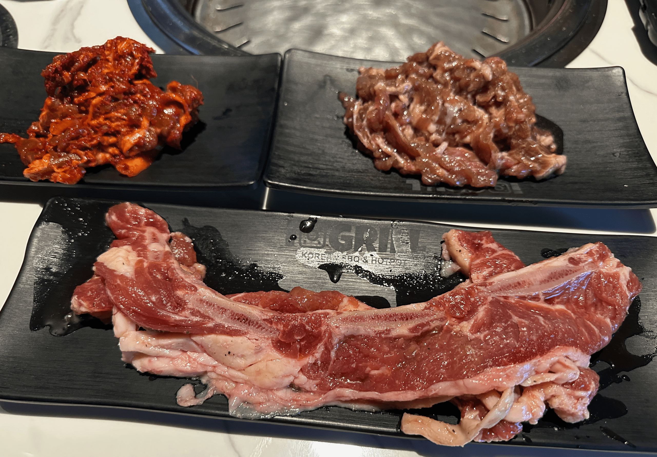 If you’re new to the concept, you won’t necessarily get much more than basic instruction from the affable wait staff. Even worse, the numerous trays of sauces and condiments aren’t labeled so if you’re not intimately familiar with Korean sauces and marinades, you’re taking your chances. In keeping with the restaurant’s feeling of modernity, you’ll be presented a tablet with which to place your order. The basic AYCE menu is priced at $24.95 per person as of this writing. An option offering “premium” meats is somewhat more pricy. Within minutes after selecting your desired meats, employees ferry out your selected proteins–tangles of red and pinkish meats, some leaning to a shade or orange because of the marinade for which spicy Korean barbecue is renowned.
