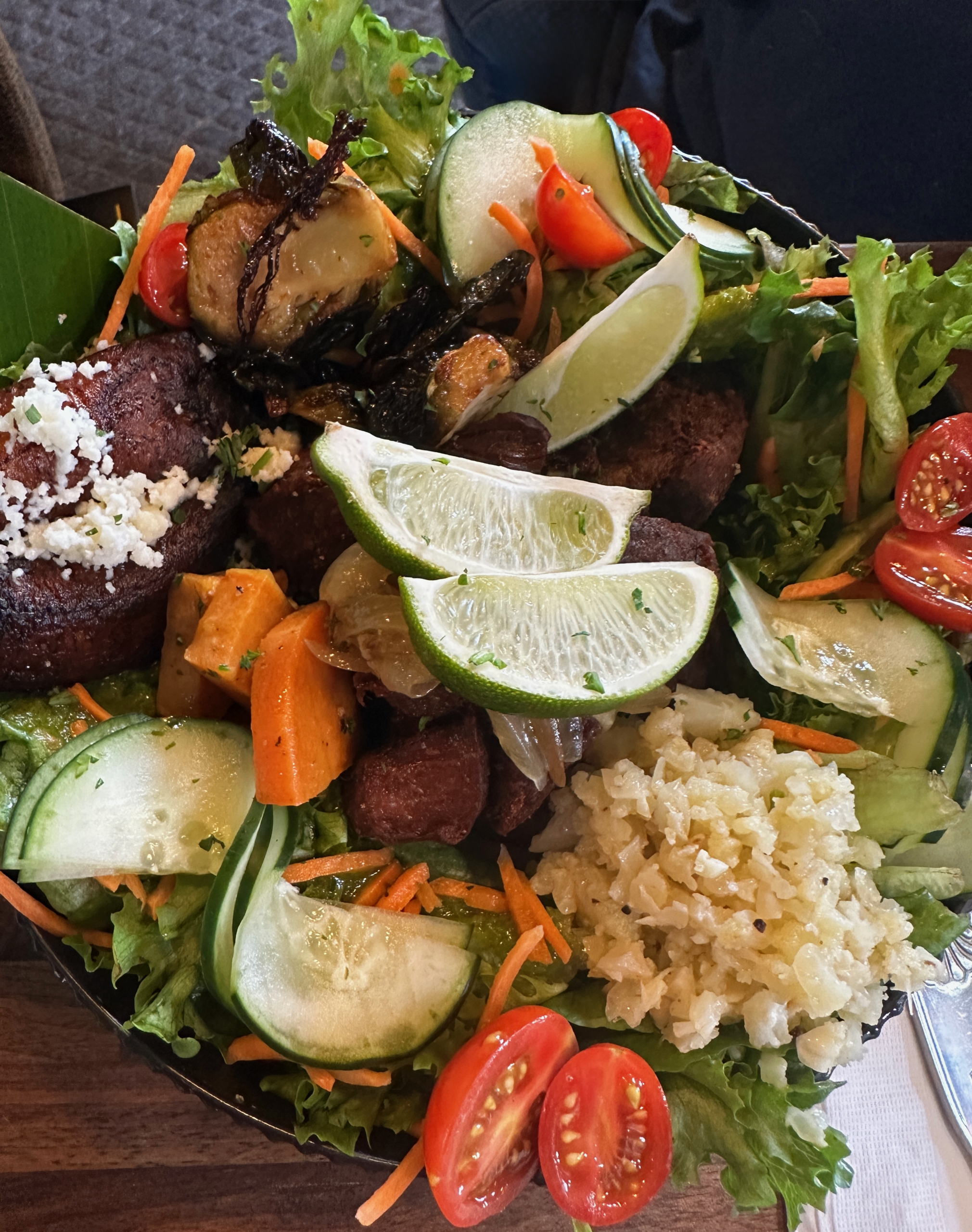 My Kim’s choice was the chicharron plate which came with beans and sweet plantains atop a bed of fresh greens. Normally this plate also includes rice, but my Kim opted for something else, a cauliflower dish that actually resembled rice. The chicharrones are chunky, biite-sized nuggets of porcine perfection. Unlike New Mexican chicharrones which are mostly fatty with traces of pork meat, these chicharrones are more meat than they are fatty. They’re crispy, crunchy and comparatively low in salt. The cauliflower was wonderful. Sometimes we forget it can be even when not covered in queso. This plate is available with ropa vieja (shredded beef) or carnitas (pulled pork). Maria related that a Cuban customer once asked for “ropa sucia” which translates to dirty clothes.