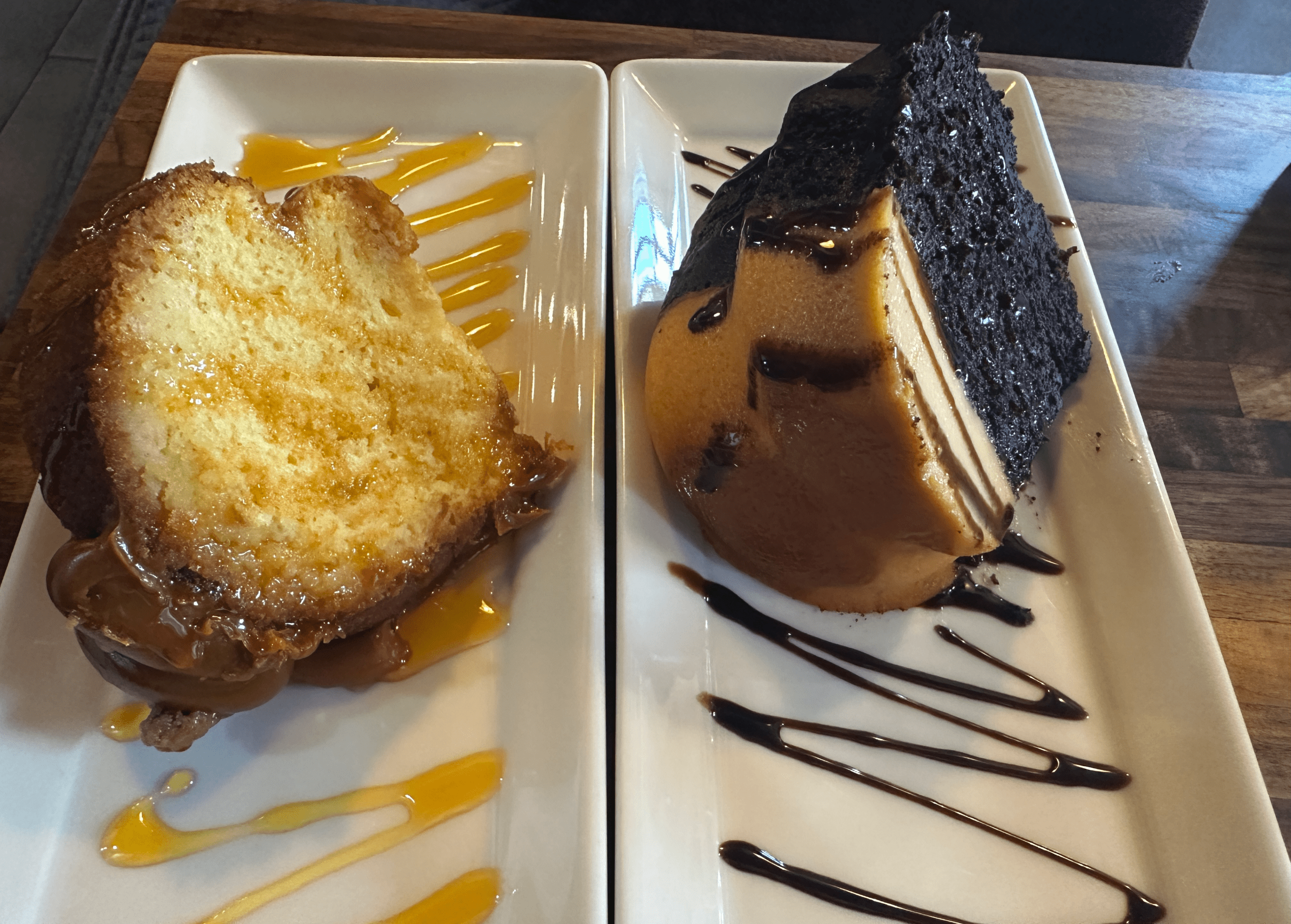 Knowing we both had a generous slice of cake awaiting us should have made us polish off our meals more quickly, but frankly we were enjoying our bounty so much that we savored slowly. The cake was certainly well worth waiting for. My clice was the rum and pecan cake, a very moist and very delicious slice drizzled with caramel. The alcohol content of the rum may have been burned off in the baking process, but the flavor of rum is strong and oh, so wonderful. My Kim’s chocoflan was equally formidable. The butterscotch flan layer was my favorite while my chocoholic bride enjoyed the rich, moist chocolate and the chocolate drizzle. If these two cakes are indicative of Kattya’s baking skills, you should plan on a visit to Buen Provecho soon.