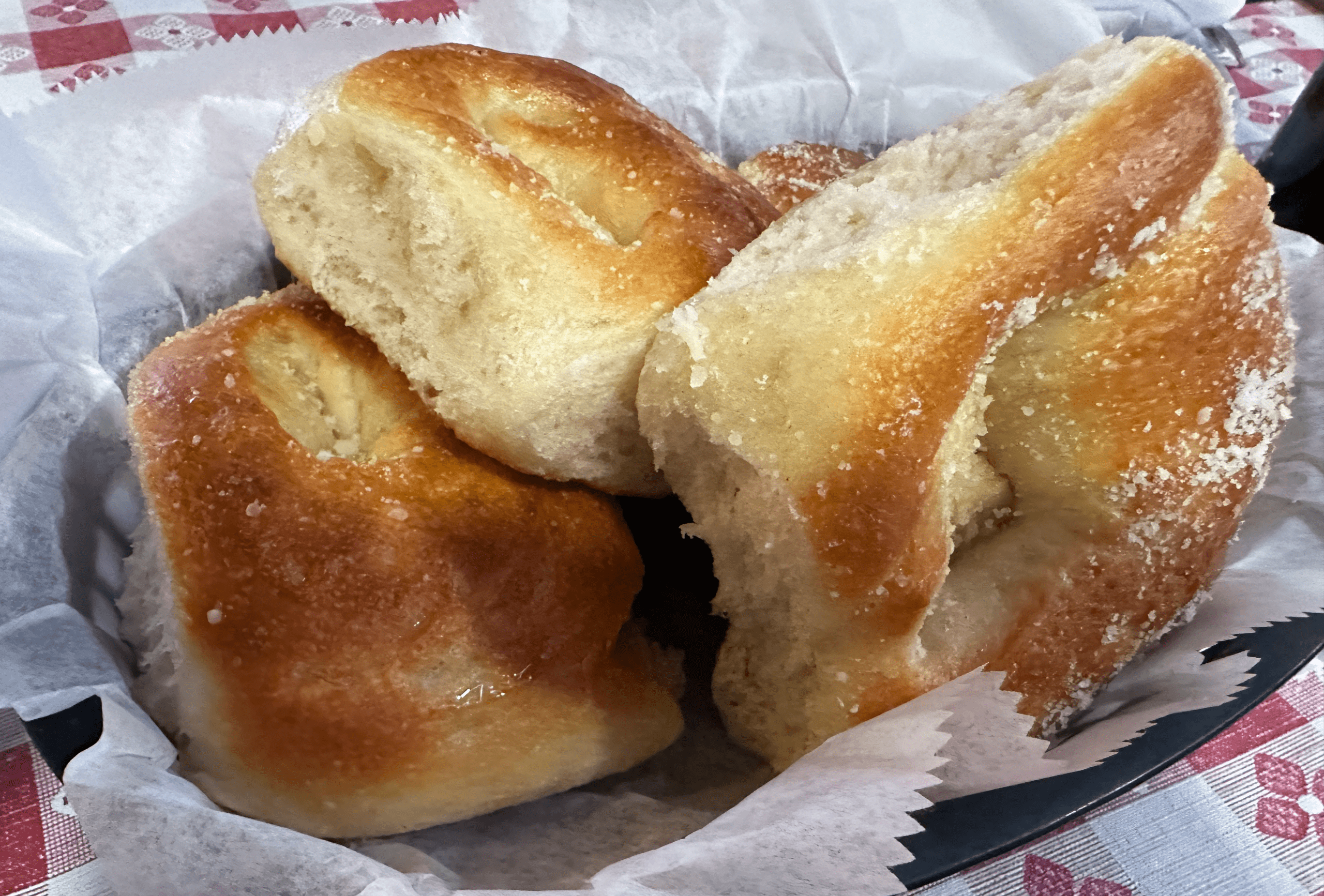 As we perused the menu, our gracious server ferried over a basket of garlic bread knots and asked what type of salad dressing we would like to have with our salad. Both the bread and the salad are complimentary (when is the last time you experience that). The bread knots are yeasty and fluffy with just a modicum of garlic, just enough to provide a delightfully nuanced flavor. We took three of them home and enjoyed them almost as much a day later. Our server took it as a challenge when I asked her to bring me “as much blue cheese as you can carry” for my salad. Yes, I could probably have a blue cheese dressing salad.