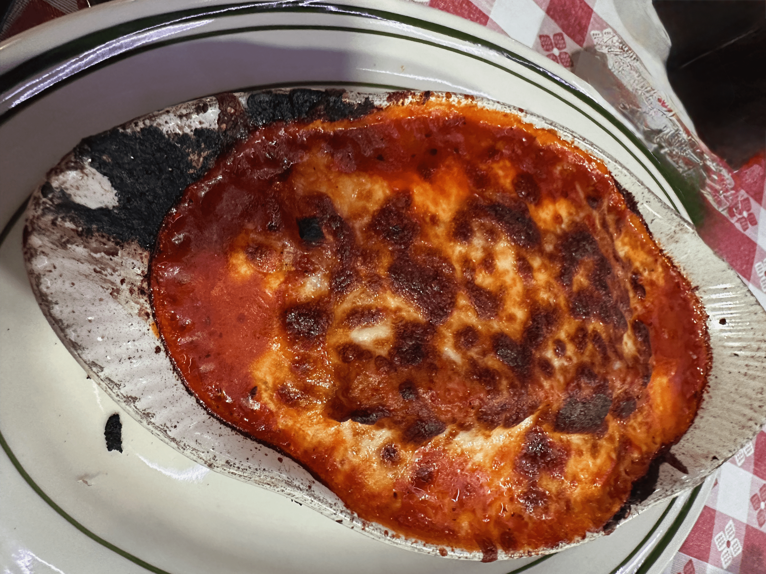 Increasingly a turophile like her cheese-loving husband, my Kim’s selection was manicotti (pasta sheets filled with ricotta, mozzarella, and parmesan cheese) baked in a casserole dish. With three cheeses on any one dish, there’s a risk that dish will be a one-note bore. Not so with this rendition. That’s because each cheese lends something unique to the pasta, both texturally and in terms of flavor profile. Joe’s fantastic red sauce cuts the richness of the cheeses, giving the dish much-needed acidity and personality. This manicotti was worthy of a meal with The Sopranos, my Kim’s favorite television drama. In The Sopranos, manicotti is a signature dish frequently featured in the family’s traditional Sunday dinners.