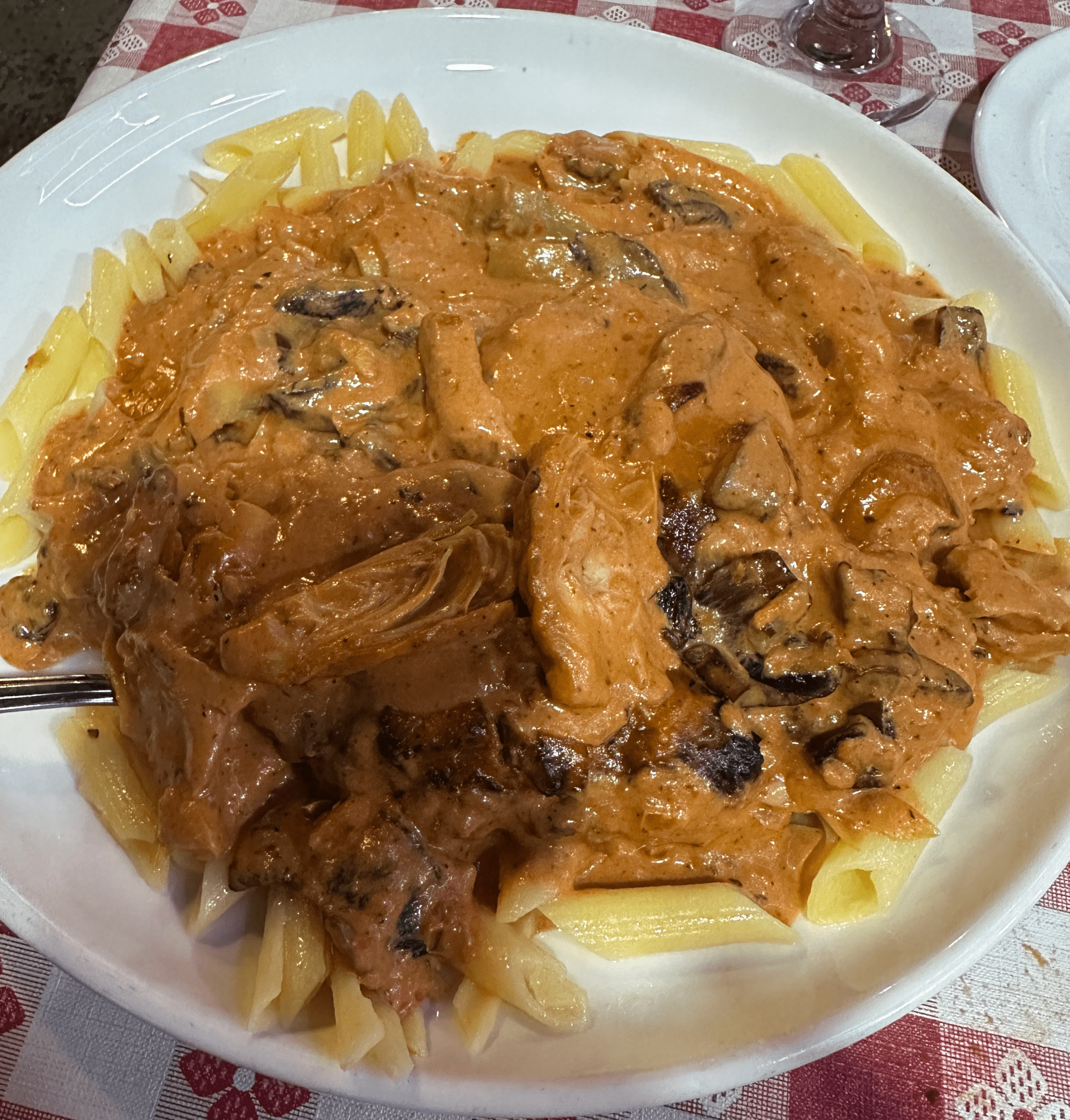 As is my approach at new restaurants we visit, I scoured the multi-page menu for a dish I’d never or have rarely had. Though the menu surprisingly had several such dishes, my choice was christened “Diana” (sautéed fresh mushrooms and artichoke hearts with a special sherry wine pink sauce over your choice of pasta). My sister-in-law Diana Calabrese Garduño would have been proud. If you don’t see “Diana” on a restaurant’s menu, that’s because it’s a regional- even restaurant-specific dish. There is no classic dish named Diana served throughout Italy. Like Greg, I reiterated the need for pounding the veal, asking our server to “pound it within an inch of its life; run it over with your car if you need to.” Even though the veal wasn’t pounded mercilessly, it was outstanding. The sauce was rich and flavorful, the type of sauce you’ll remember for a long time. The mushrooms were perfectly prepared, lending their earthiness to the dish. Penne pasta is a great choice.