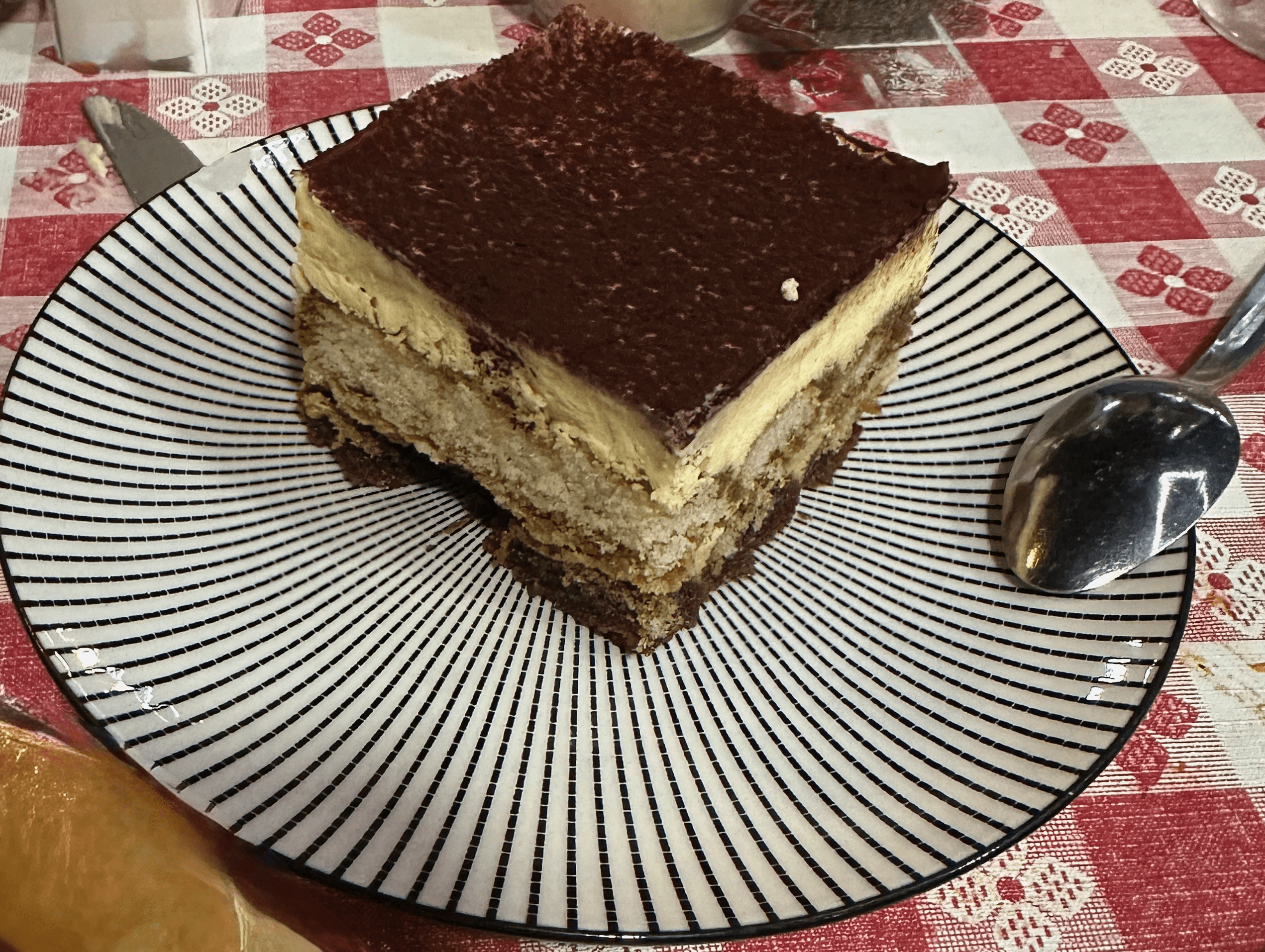 Joe’s offers a number of desserts. It’s hard for me to ever resist tiramisu. In Italian, “tiramisù” means “pick me up” or “cheer me up.” The name comes from the phrase tirami su, which literally breaks down to tira (“pull”), mi (“me”), and su (“up”). Boy does a great tiramisu have that effect (both picking me up and cheering me up) on me. A great tiramisu is chracterized by a light, yet rich, layers of espresso-soaked ladyfingers interspersed with a smoth, creamy mascarpone and egg-yolk cream, all finished with a dusting of cocoa powder. Ideally, tiramisu balances the bitter coffee flavor with the sweet, tangy cream, creating a luxurious, airyl texture that melts in your mouth. Mission accomplished, Joe’s.