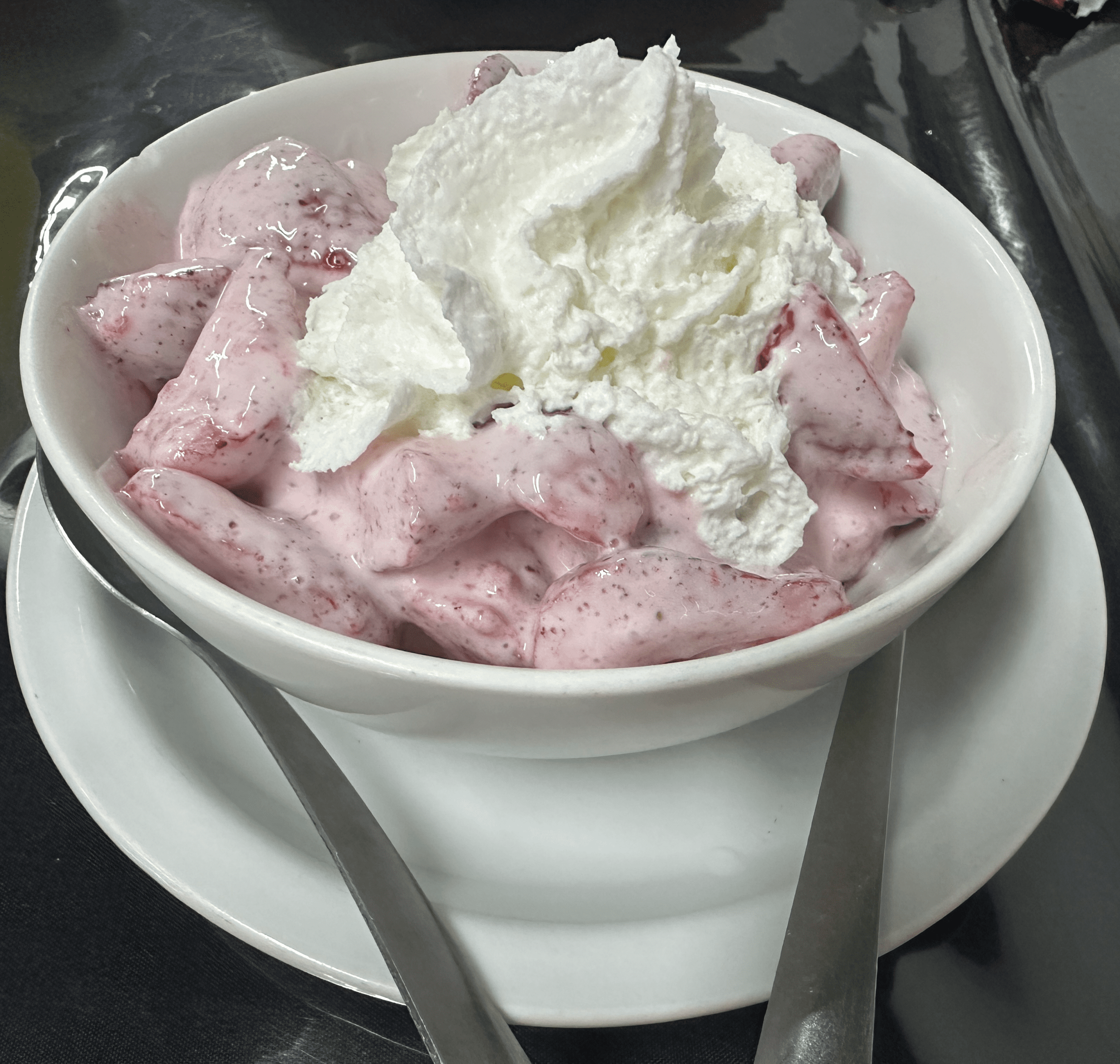 Three desserts–fresas con crema, flan and arroz con leche–are on the menu. In honor of my mom’s wonderful strawberry garden, fresas are a favorite dessert of mine. Fresh, luscious macerated strawberries are topped with Mexican sour cream and sprinkled lightly with sugar. Few things in life are as wonderful. My Kim, who often eschews desserts if they’re not ice cream, polished off nearly half of a dessert I had hoped she wouldn’t like much. My mom would have loved this fabulous dessert.
