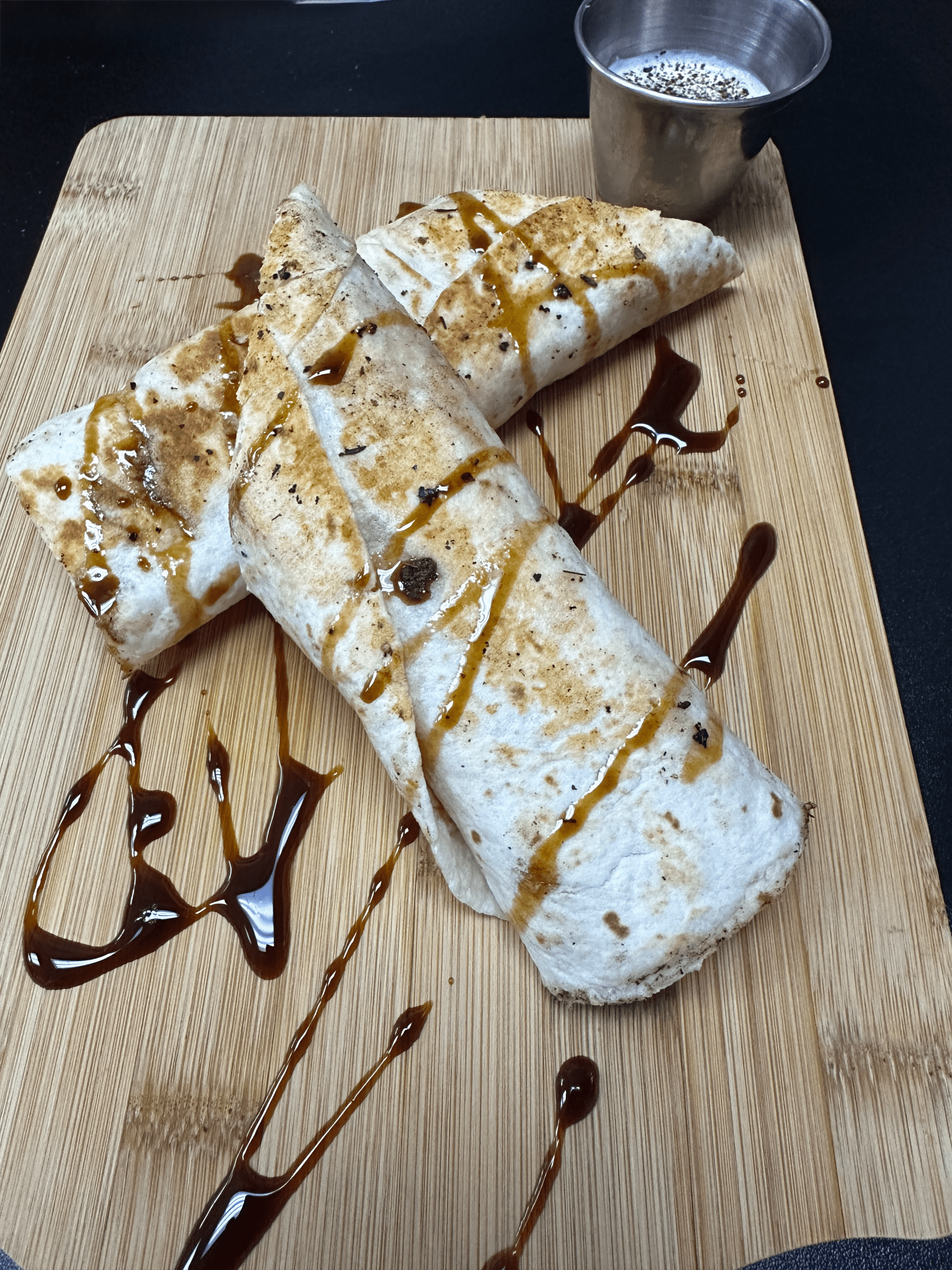 2 October 2025: My Kim’s choice was a beef kebob wrap. Instead of Arabic (pita-like) bread, the wrap was made with shrak bread, a large, unleavened, and extremely thin flatbread reminiscent of a flour tortilla. The shrak is engorged with moist, well-seasoned beef and is served with a yoghurt sauce somewhat like tzatziki. Drizzled onto the board on which the wrap is served is a pomegranate sauce not unlike a good balsamic. Noticing how enamored we were of the pomegranate sauce, Sufyan told us it’s available in the market as is a similar sauce made with dates. Though not nearly as thick as gyros, sliced in two the wrap might be even larger. It’s also quite good.