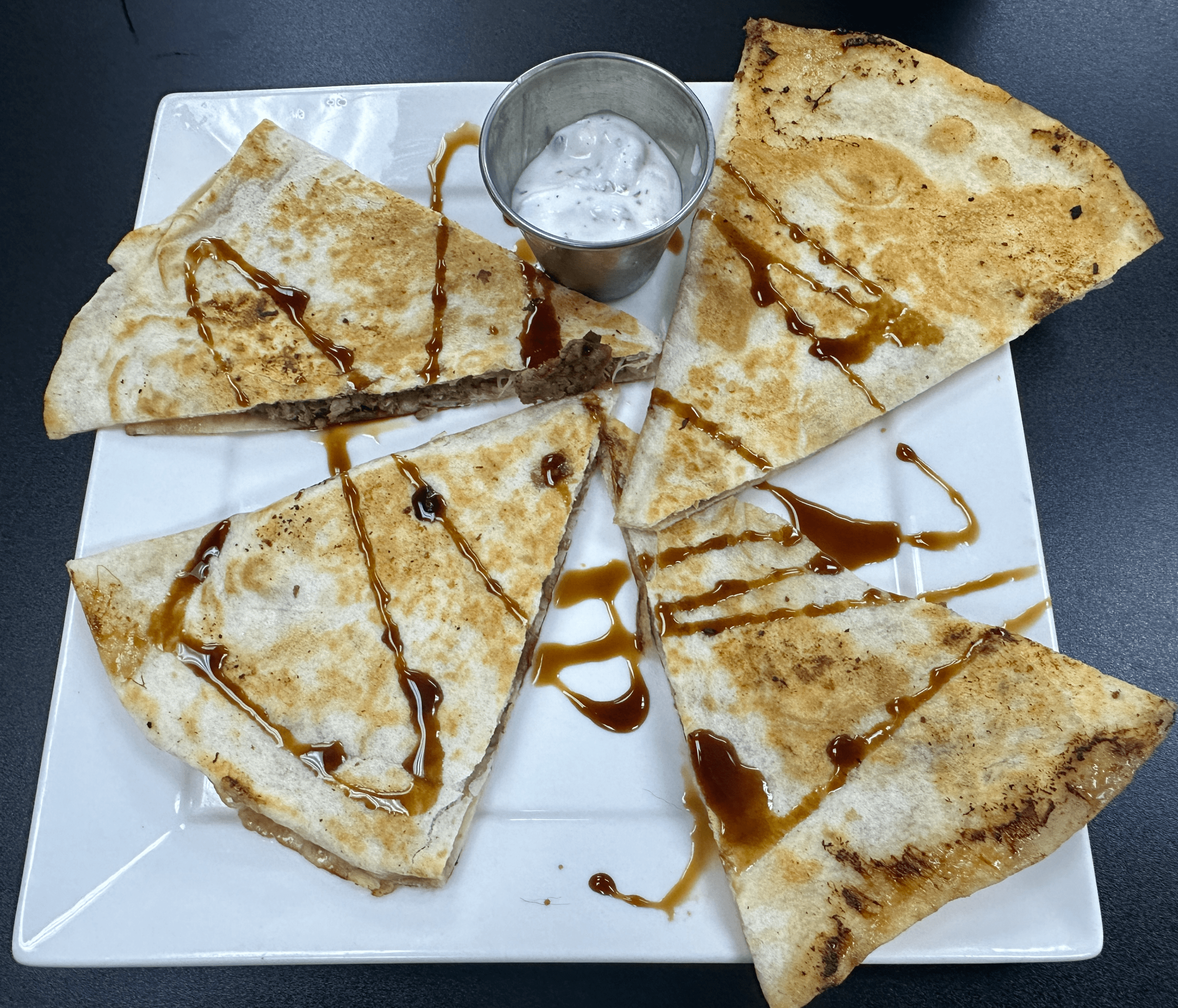 10 October 2025: Though it’s difficult to pry ourselves from the appetizer combo, we had to try arayes, a delightful appetizer neither of us had previously had. The menu describes arayes as “toasted bread filled with meat, onion, parsley and Palestinian spices. Four triangle-shaped wedges are drizzled with a sweet-sour date syrup and served with tzatziki sauce. Crispy Arabic bread is a new experience for us. Each wedge is crispy while the ingredients sheathed within are tender and moist. The date syrup adds a surprising dimension, one counterbalanced by the tangy, slightly sour tzatziki sauce. This is yet another great starter.