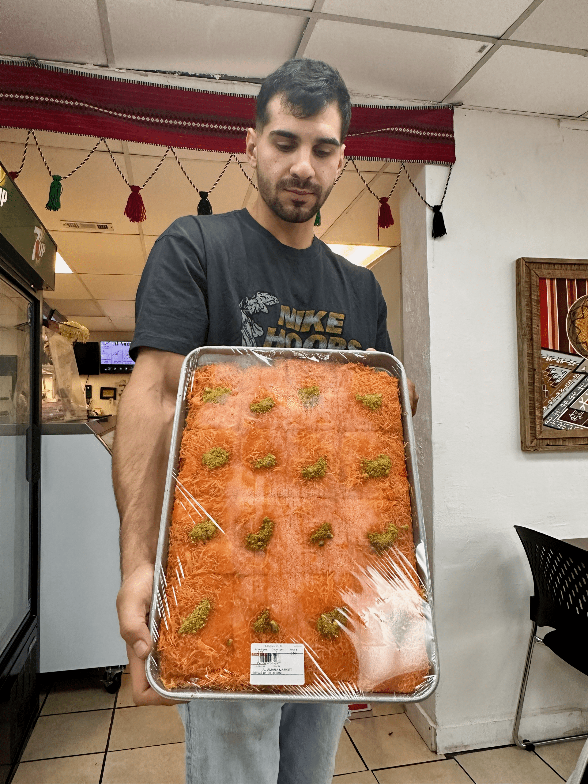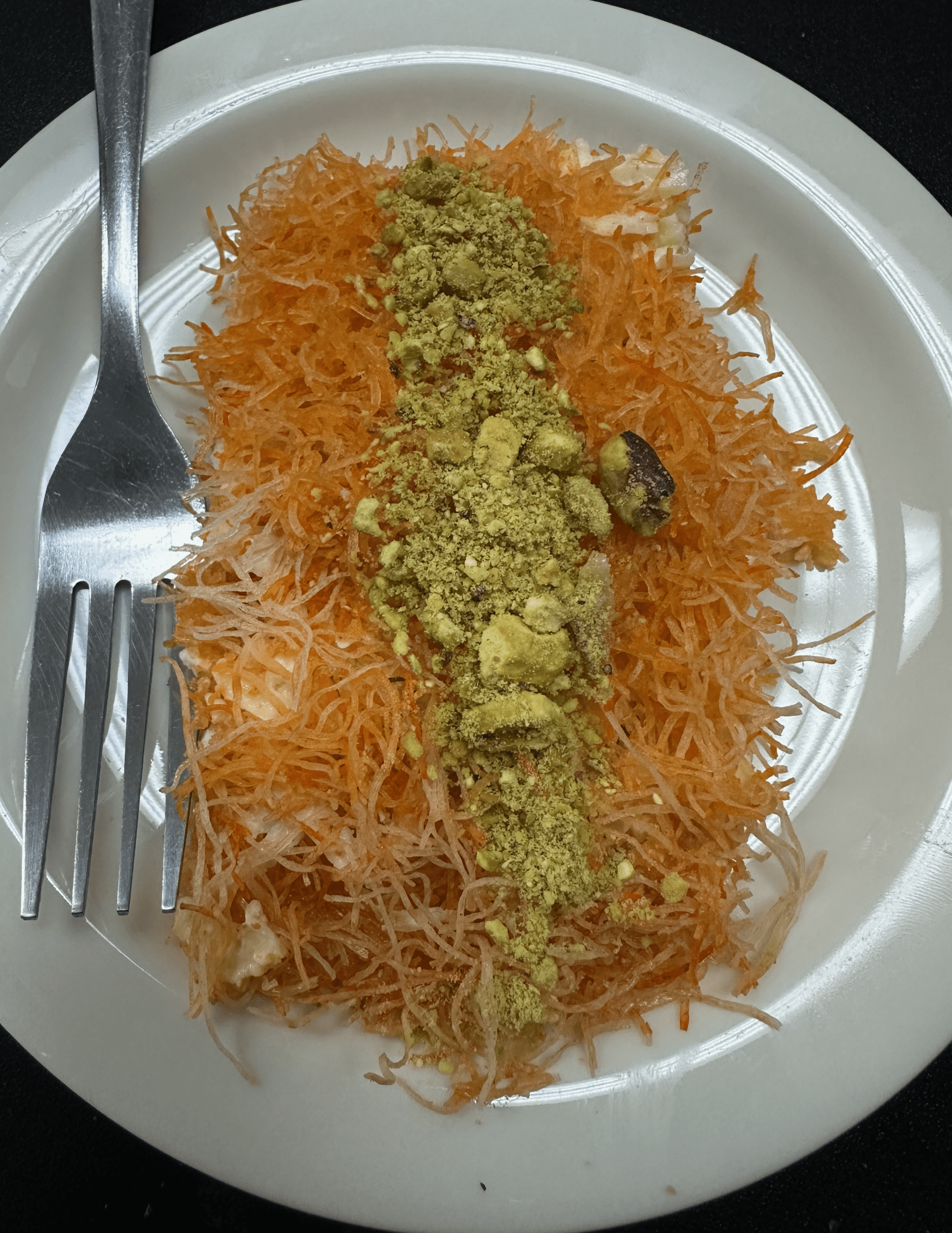 2 October 2025: Unless you already know what it is, the first time you see a slice of knafeh destined for your table you’re likely to think it’s topped with shaved carrots similar to my favorite Indian dessert Gajar ka halwa (make sure to visit Namaste for my favorite version). Despite appearances, no carrots were harmed in the creation of knafeh, one of the most popular of all Middle Eastern desserts. My Egyptian friend and former colleague at UNM, Nader Khalil introduced me to this fabulous dessert some time ago and it’s become an obsession for me, too. Norah’s version is superb! What you might mistake for carrots is actually crunchy kadaif (angel hair) made from wheat flour and sugar with water into a type of phyllo dough and then shredded to resemble fine angel hair. Two layers of kadaif are filled with a layer of akkawi (a warm cheese), sprinkled with nuts, and baked. After baking, the warm kanafeh is topped with a delicious syrup of sugar and rose water then topped with crushed pistachios (almost necessary because this is a very sweet dessert). Kanafeh just might just become one of your favorites.