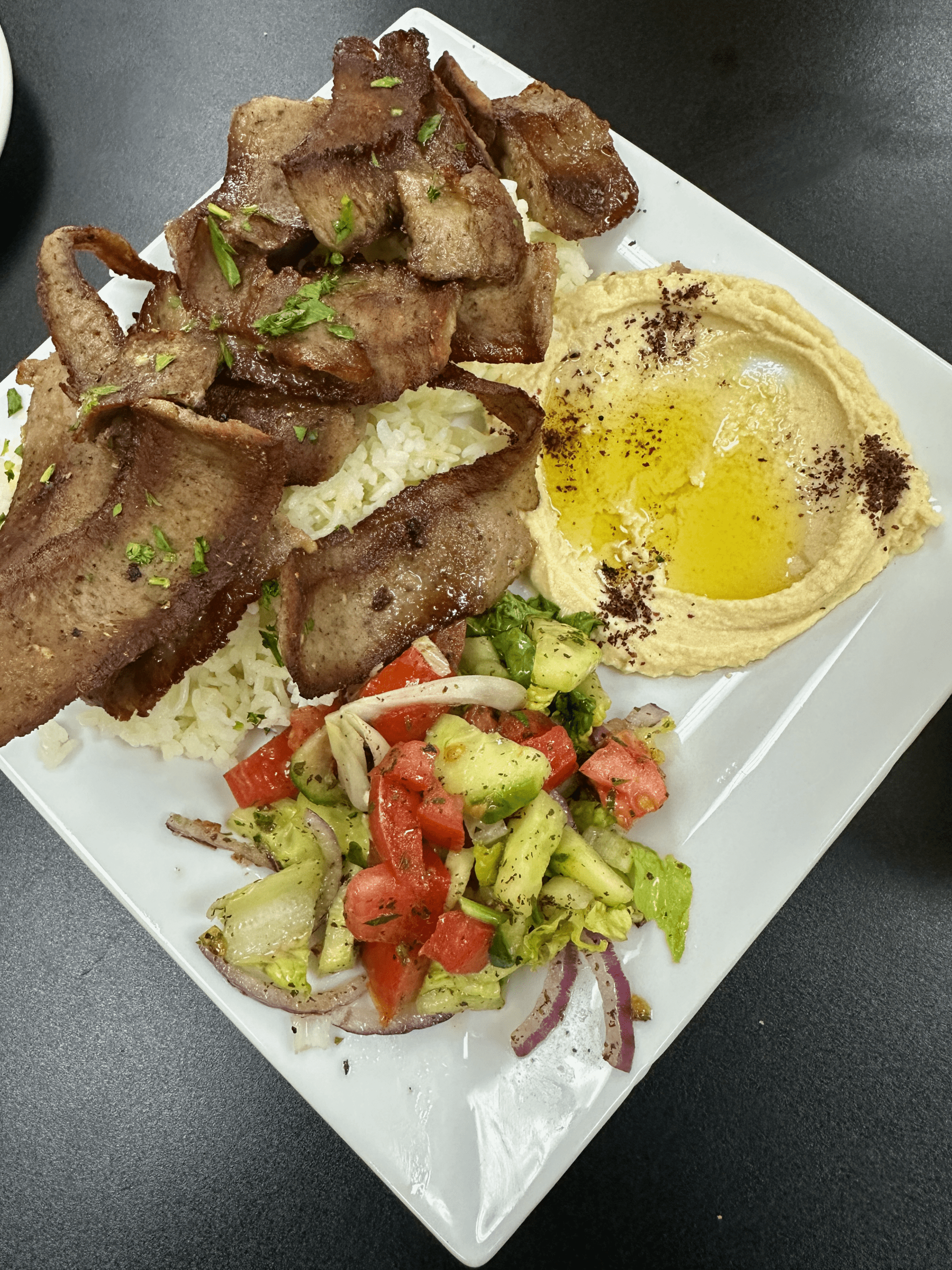 10 October 2025: Although the standard definition of a gyro is “meat cooked on a vertical rotisserie, then sliced and served wrapped or stuffed in pita bread,” Nora’s version (special gyro on the menu) comes with pita on the side. This plate is replete with gyro meat (an amalgam of beef and lamb) atop rice, an Arabic salad (fresh tomatoes, onion, cucumber, lemon, Palestinian olive oil) and hummus. Every element of this plate is as good as it can possibly be. My Kim found the Arabic salad surprisingly good for such a simple salad. Credit the freshness of each ingredient for that. The gyro meat is nicely seasoned with a slightly crispy exterior and tender, moist interior.