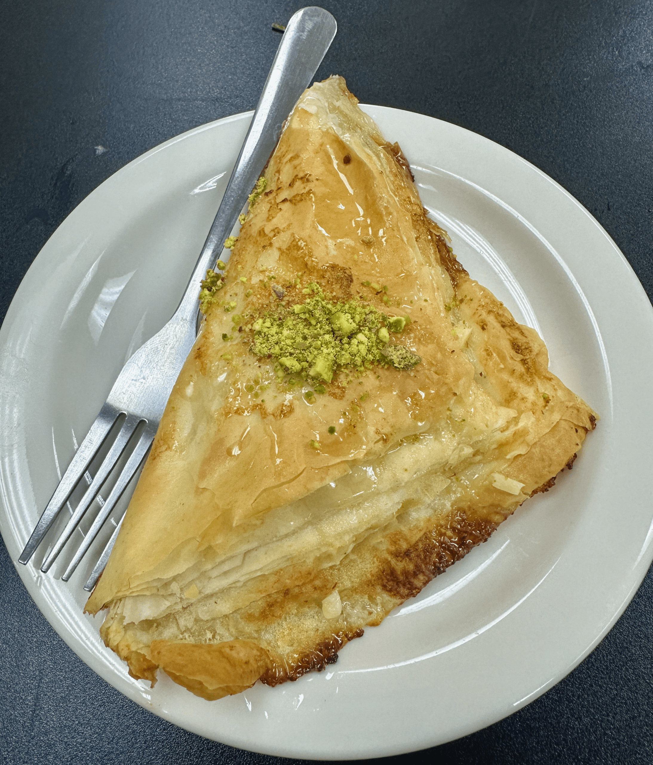 10 October 2025: For as long as memory serves me, my favorite Middle Eastern dessert has been pistachio baklava. Greek baklava (too sweet) doesn’t cut it. Middle Eastern baklava–whether topped with pistachios or walnuts–is much more balanced, not cloying. Sufyan introduced me to a heretofore untried dessert that may have supplanted pistachio baklava for my affections. That dessert is warbat (no, not Godzilla’s nemesis), a sweet, flaky, triangle-shaped Middle Eastern pastry. Layers of thin phyllo dough are brushed with ghee (clarified butter) or butter and filled with a creamy custard known as ashta. After being baked to a golden crisp, it is drenched in a fragrant sugar syrup then often garnished with crushed pistachios. It’s an outstanding desert!