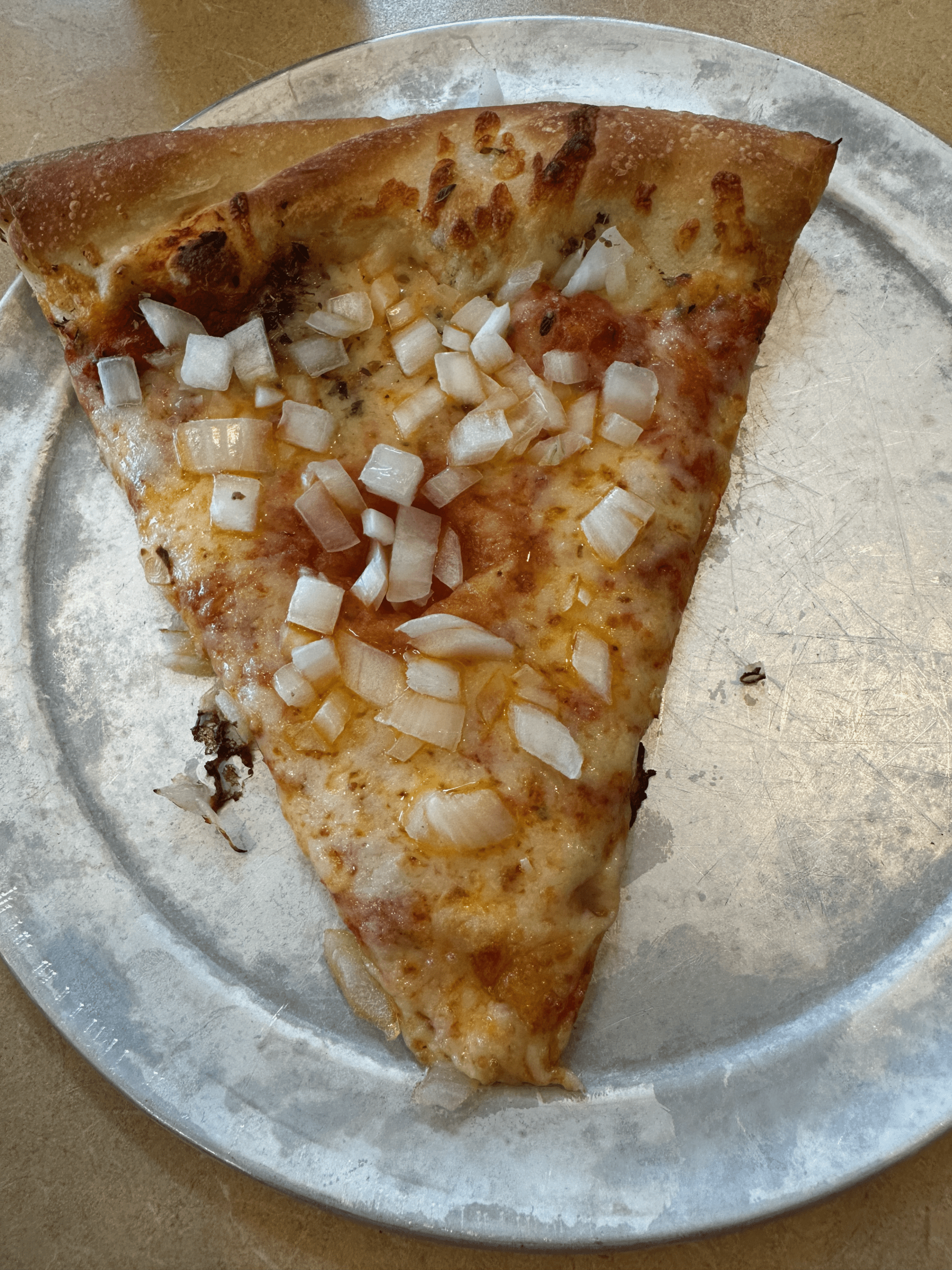 When Trail Rider got its start in the parking lot of Molly‘s Bar, its full name was Trail Rider Pizza. The restaurant earned its reputation for some of the best pizza in the metropolitan area. You can design your own pizza from a phalanx of ingredients or you can order from about ten different specialty pies including one bearing the curious appellation “DWI” (pepperoni, sausage, black olives, mushrooms, onions, and fresh tomatoes). If you don’t order a pizza, do yourself a favor and at least order a slice. It’s an excellent pie. Toppings for my initial slice were onions and cheese. Not surprisingly, the crust is magnificent. It doesn’t flop around like a floppy fish. Nor is it as stiff as a board. It’s somewhere in between with a crispy crust that chews nicely. The tomato sauce is terrific, too.