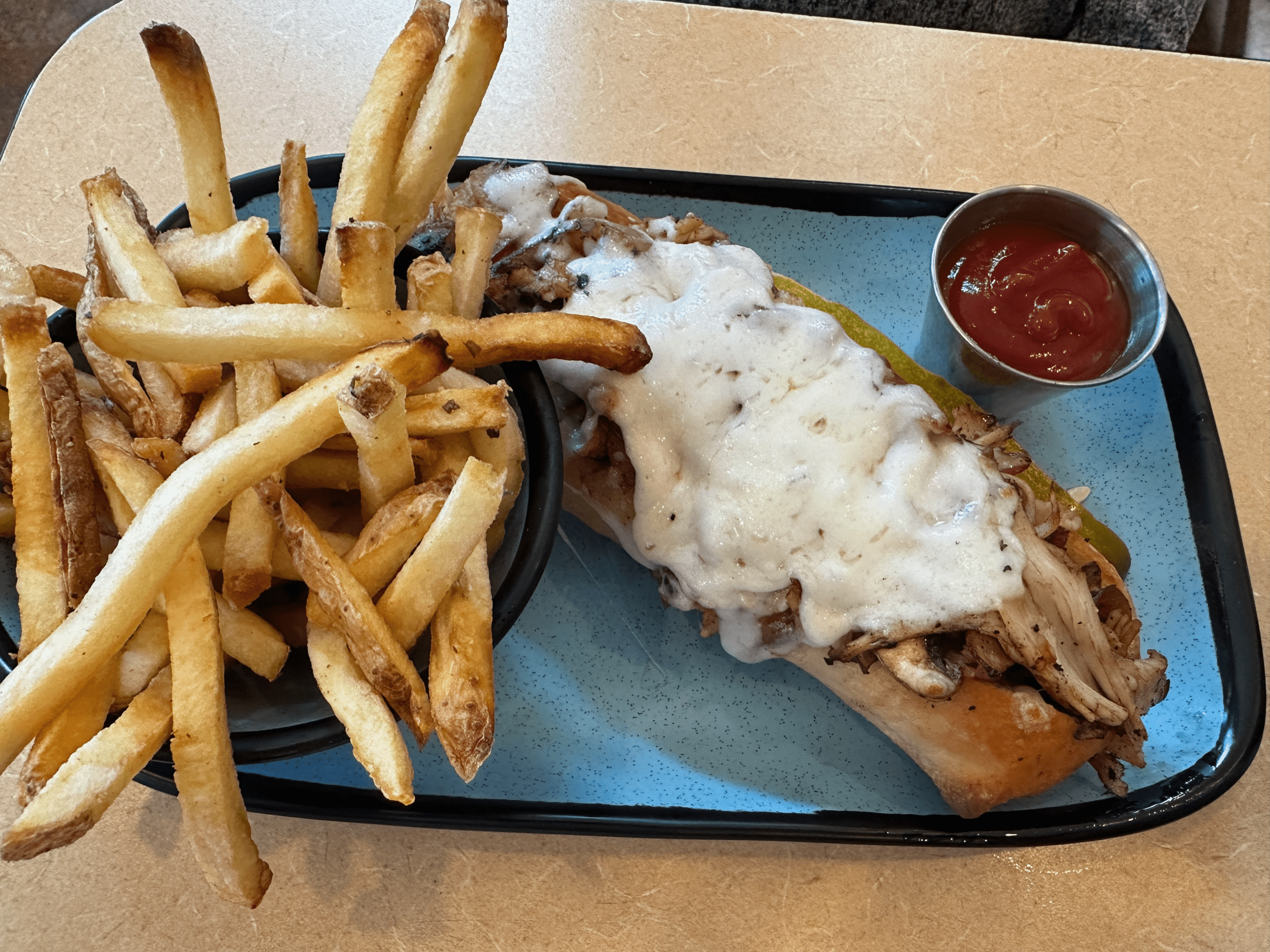My Kim’s sandwich choice is called the Mary Lou (house-smoked turkey breast, ham, mushrooms, onions, and green chile sautéed and toasted with mozzarella). Naturally she asked for the green chile to be omitted. Unlike the well-smoked pastrami, the turkey breast has a very light smoke. That’s apropos for a more delicate and sweeter protein. To no surprise, the housemade hoagie roll was excellent. A molten blanket of mozzarella hides much of the sandwich contents. Sandwiches and burgers are served with a side of house-cut fries or you can substitute a side salad or seasonal soup for a pittance more. You can also substitute a gluten-free bun. The fries are thin-cut with a good amount of salt.