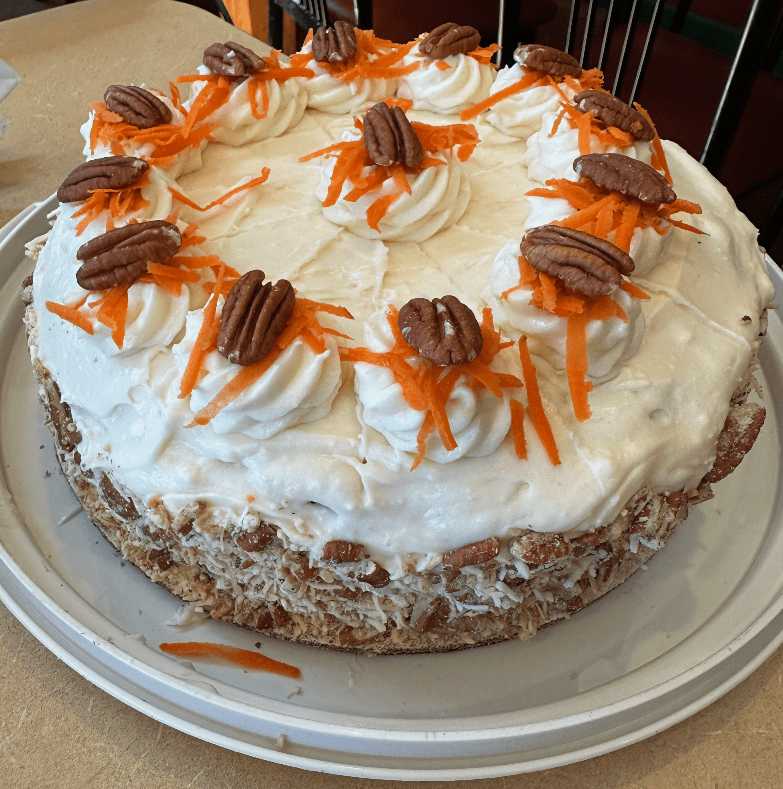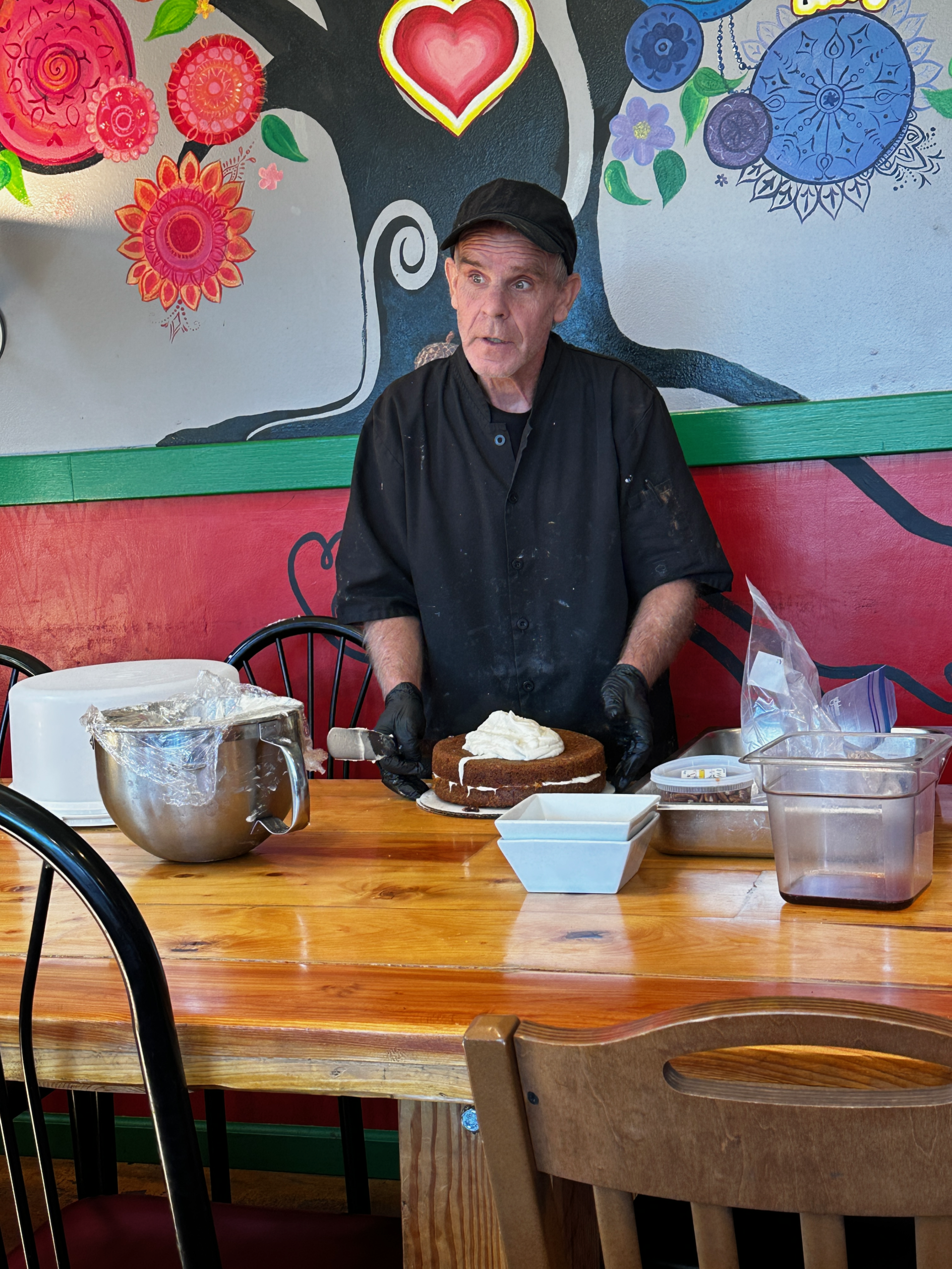 We were seated across the aisle from baker Joe, almost close enough to sneak a bite of the three-layer carrot cake to which he was putting the finishing touches. With the precision of Michelangelo sculpting a slab of priceless Carrara marble, Bob lovingly decorated each layer, creating a masterpiece sure to be enjoyed by diners. Joe has an impressive pedigree. He’s an veteran of the Gulf War where he kept his brothers-and-sisters-in-arms well-fed. After a twelve-year service career, he worked as a baker at Flying Star back when it was still known as Double Rainbow. After his stint at the Central Avenue eatery, he became the baker at the Greenside Cafe. From the Greenside Cafe, it’s an easy hop, skip and jump to Trail Rider.