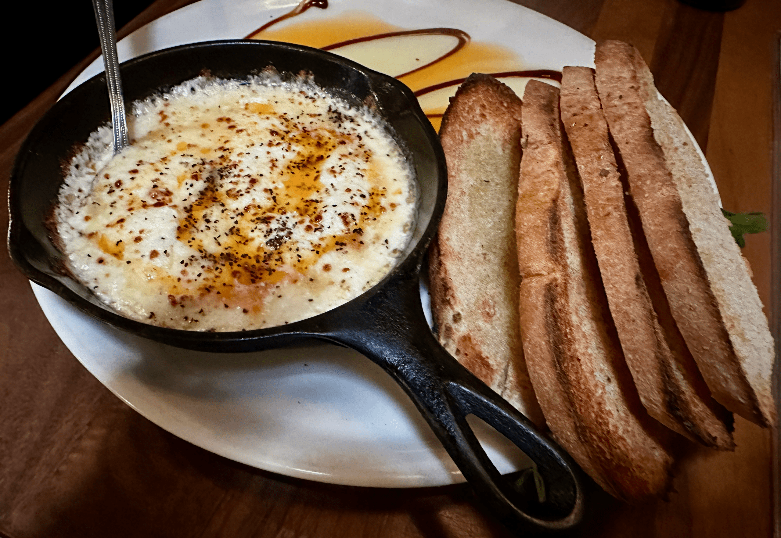 18 October 2025: Though all the Antipasti are enticing, your not-always-humble blogger recommends the wood-fired stracciatella a creamy, warm appetizer made with house-made mozzarella and ricotta, topped with a honey balsamic reduction and cracked pepper, and served with house-made crostini. It is finished with a drizzle of olive oil and can be optionally enhanced with Prosciutto di Parma. The dish is a rich and savory appetizer where the wood-fired cooking melts the cheeses together for a decadent starter. It may ruin all other Antipasti for you. Even as our arteries hardened, my Kim and I worked diligently to scrape every bit of the melted molten cheese from the bowl.