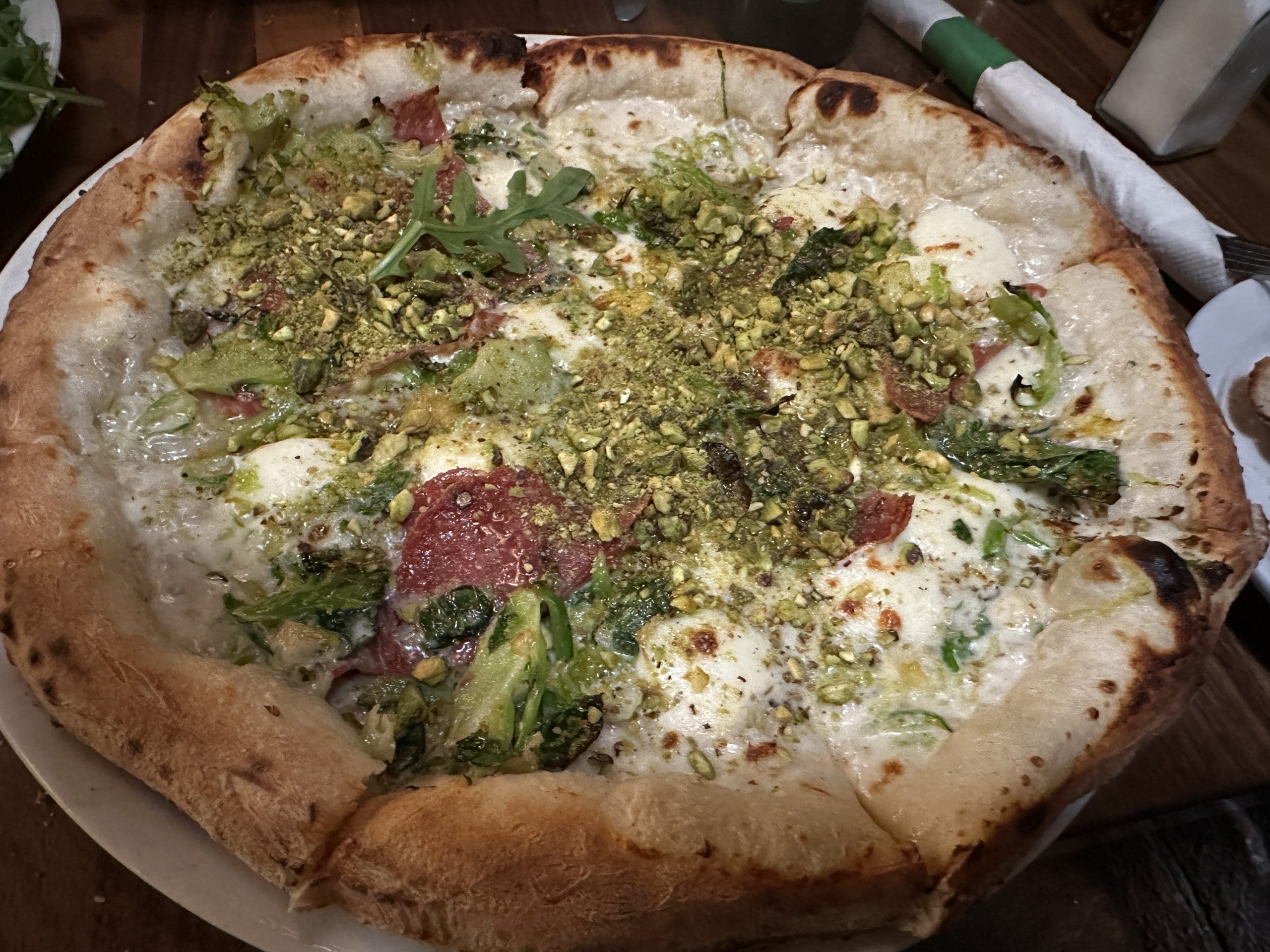 18 October 2025: The pizza that won my heart is the Belgio Dolce (a creative, thin-crust pizza with a white cream sauce base, house-made mozzarella, Pecorino Romano, soppressata, and shaved brussel sprouts marinated in Calabrian chili oil. It is finished with crushed pistachios, a drizzle of local honey, and more chili oil for a spicy-sweet flavor profile. The name Belgio Dolce translates to “sweet Belgium” though our server couldn’t tell us why. This pizza is imbued with magic as well as a multifarious flavor profiles: spicy and savory (soppressata and Calabrian chili oil), sweet and nutty (honey and pistachios), and rich and creamy (white sauce and mozzarella). Thanks to the Pecorino Romano and the brussel sprouts, you can add umami and earthiness to the complex flavors that bless this pizza.