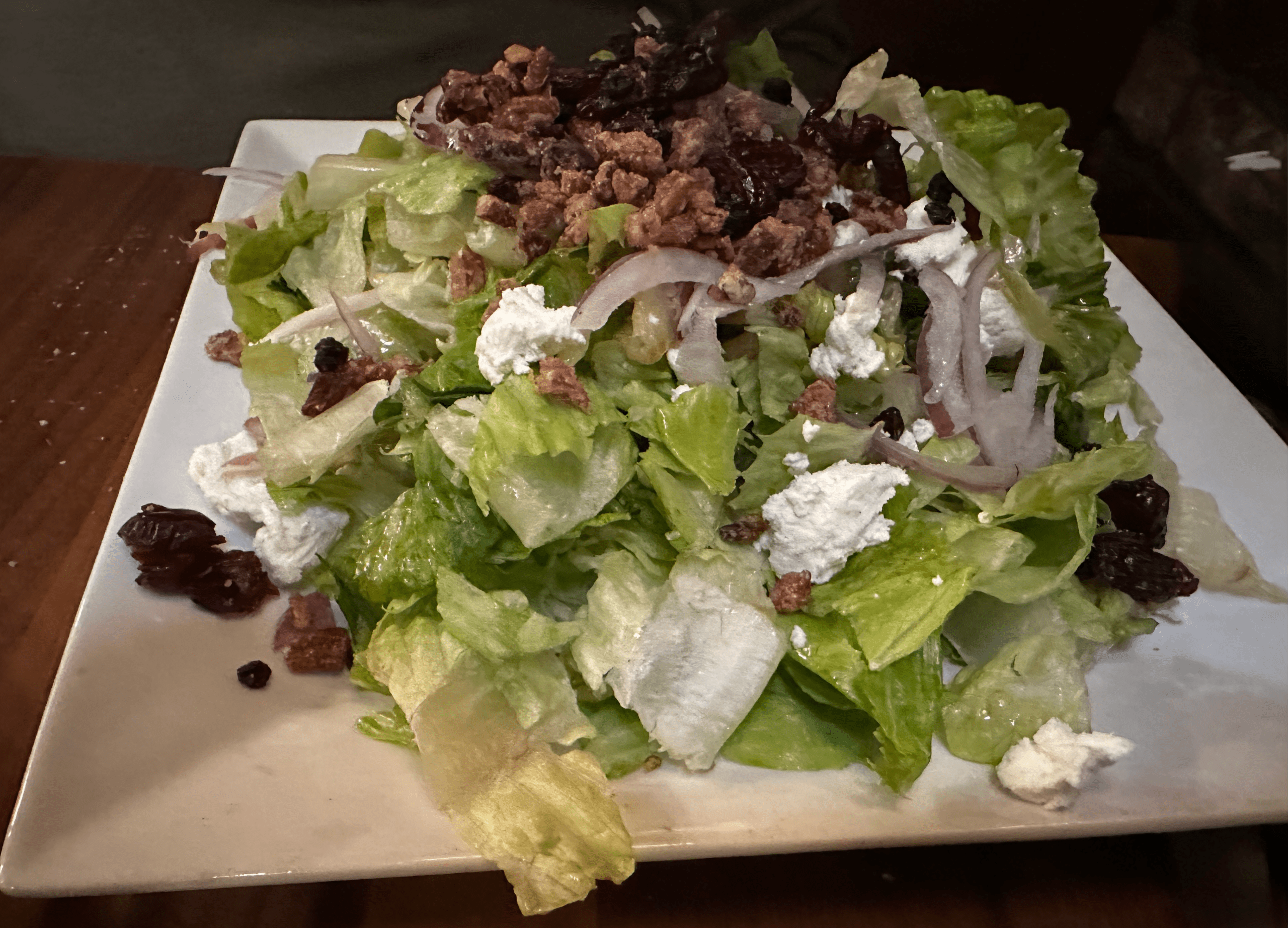 18 October 2025: My Kim is one of those weird people who can visit a pizzeria and order a salad. Aargh! Why did I marry her? In her defense, that was no ordinary salad she had. Fittingly, it’s called Fat Olives (organic greens, goat cheese, dried currants, cranberries, candied pecans, red onions, lemon balsamic vinaigrette). Though olives aren’t a standard ingredient on this salad, you can always order marinated oven-roasted olives from the Antipasti section of the menu. Then you can add them as you please…or better still, enjoy some of the beauteous briny gems. This salad is large enough to constitute an annual allotment of greens for some people. It’s humongous. My Kim finished less than half of the salad and nearly wept that we couldn’t take it home.