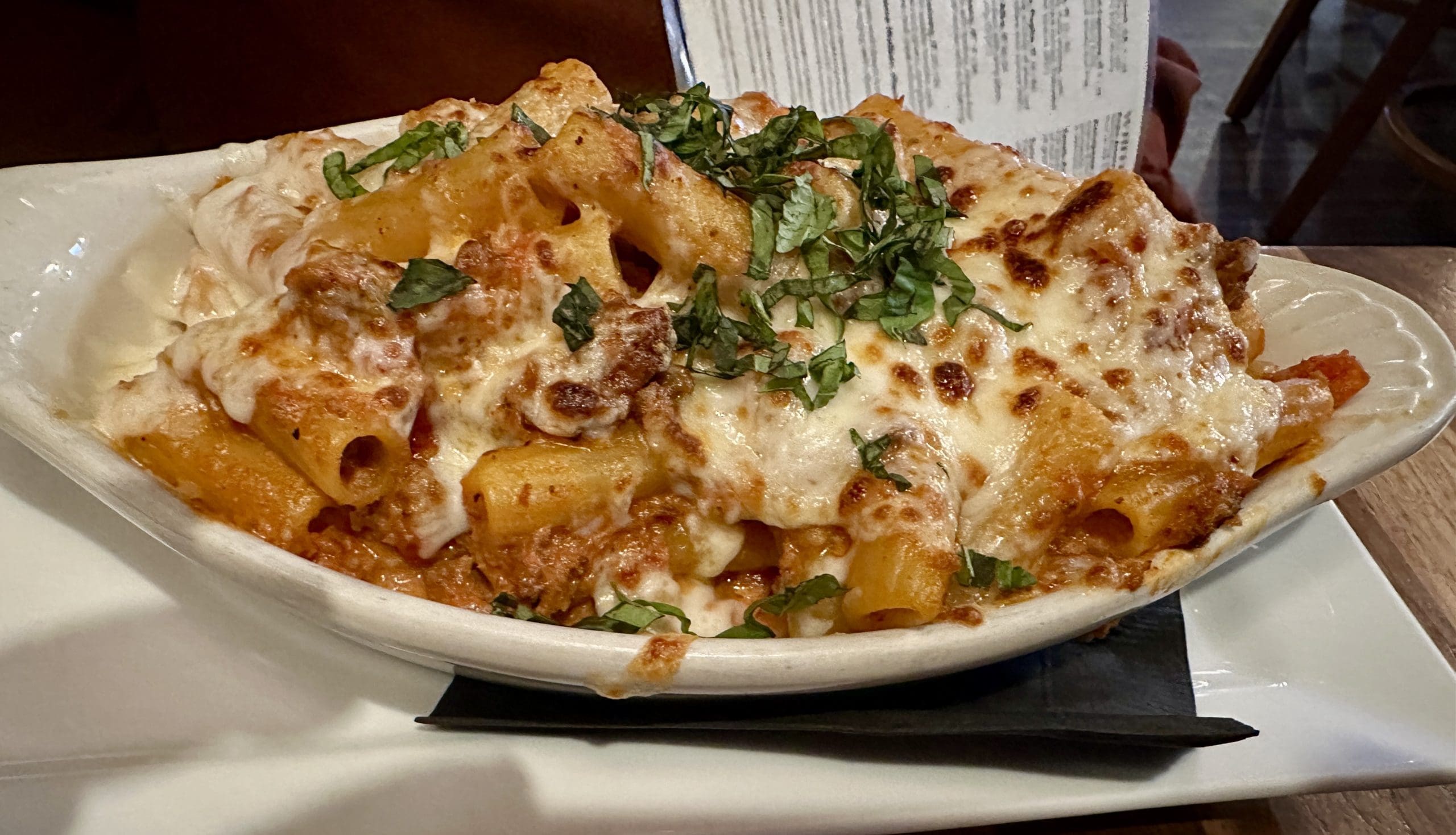 Our server, the effusive Matty, actually told us we wouldn’t regret ordering any of Fat Olives’ pasta dishes instead of pizza. She indicated most guests rave about the lasagna which is made with a ten-hour ragu, ricotta, mozzarella-Provolone blend, grana padano and a basil chiffonade. This lasagna is served in a casserole dish and doesn’t appear to have the layered appearance of traditional American-Italian lasagna. Several features stand out about this lasagna. First is the cheese blend, an extraordinary blend of three cheeses that most assuredly go very well together. Second is the ragu, an Italian meat-based sauce, slow-cooked (for ten hours) in a tomato sauce. I could bathe in that elixir. Third is the basil chiffonade, thin slices of Italian basil. Frankly, every aspect of this lasagna is first-rate. It’s among the very best restaurant lasagna I’ve had outside of the Boston area.