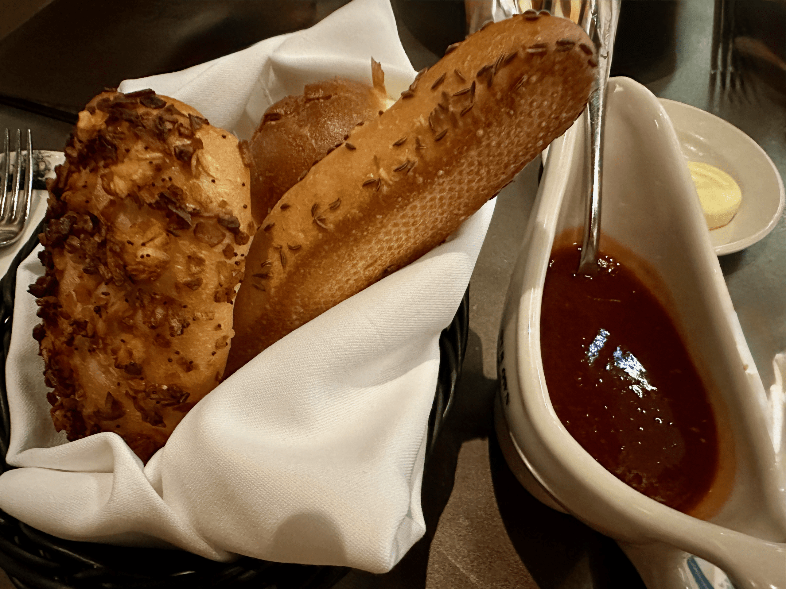 As we contemplated the menu, Yan ferried over a basket of warm, fresh, out-of-the-oven bread accompanied by a gravy boat filled with Peter Luger’s steak sauce. Yan explained that the steak sauce can be used on virtually everything. It’s sweet and tangy with a mild kick of horseradish that tempers any residual sweetness. The bread basket is complimentary and includes an onion roll, a classic roll, and a caraway seeded soft bread stick. Though we had wanted more bread, Yan advised us to be mindful of how much bread we eat, as the bread is known to be filling and should be saved for before the main steak meal. As Yan predicted, dunking the bread into the steak sauce was even preferable to enjoying it with butter.