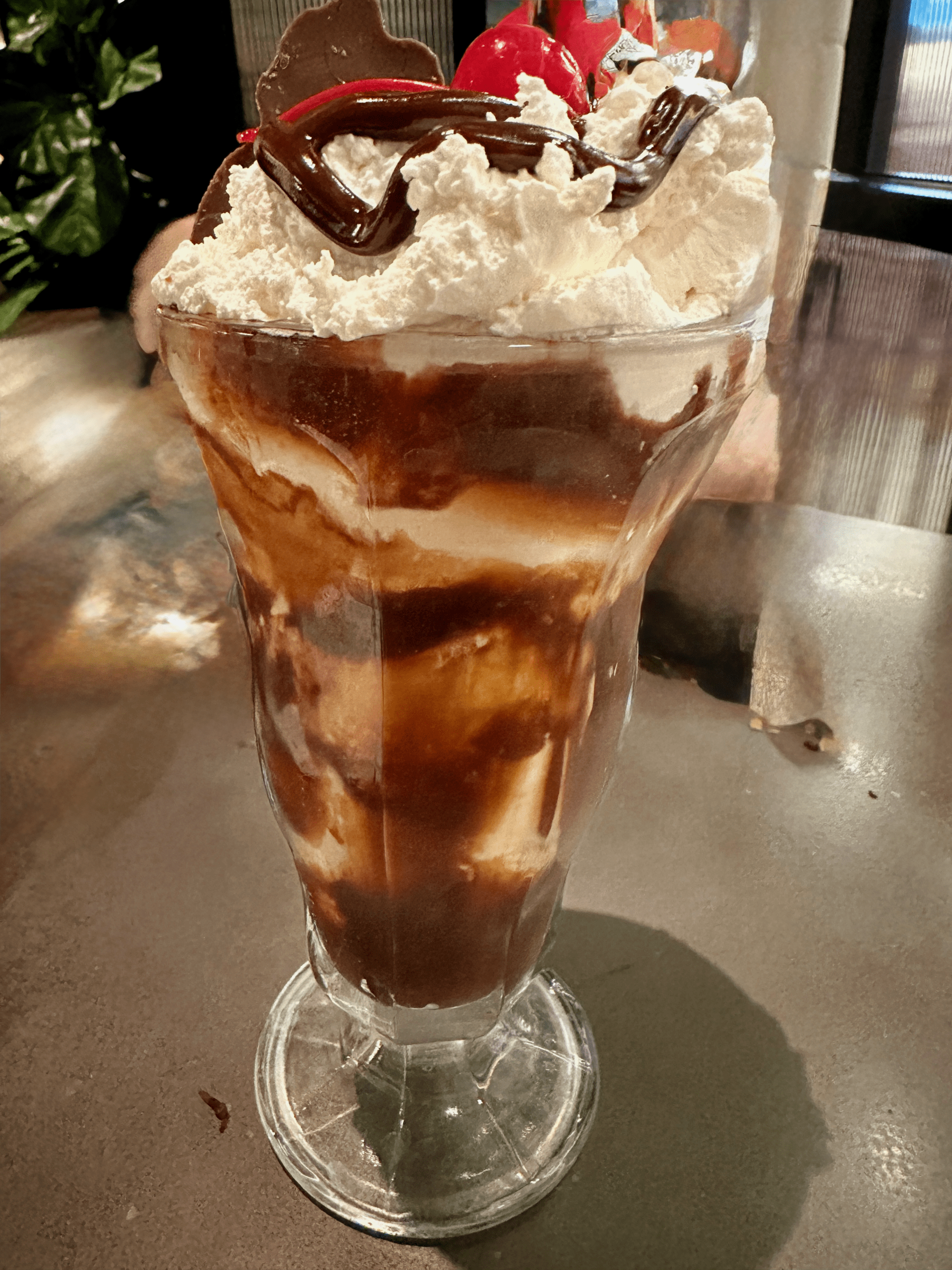 As Nigel narrated the restaurant’s dessert options–apple strudel, pecan pie and the “Holy Cow” ice cream sundae–he didn’t get any further than the sundae. Served in a large goblet some mountaineers might like to climb, the sundae is decadence and simplicity: high-quality vanilla ice cream; a rich, dense hot chocolate sauce generously poured over the ice cream all topped with a homemade whipped cream called “schlag.” Normally the sundae is topped with chopped walnuts and a milk chocolate cow. My Kim doesn’t do walnuts. This no-frill dessert is large enough to share. It’s a memorable way to finish a spectacular meal.