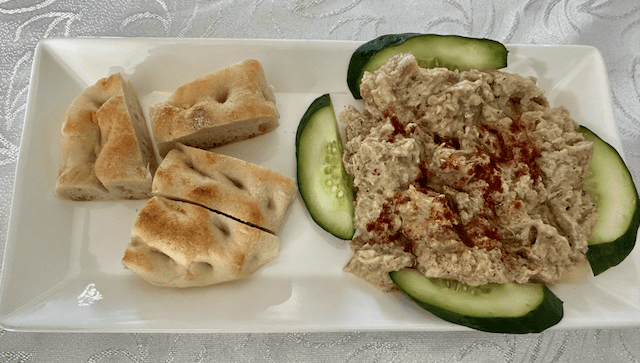 22 February 2026: In Arabic, baba ghanoush translates to “spoiled daddy” or “pampered daddy.” The name stems from folklore about a loving daughter mashing food for her elderly father or a sultan being pampered by his harem. Baba ghanoush, the creamy, silky and smoky dip made from charred eggplant, tahini, lemon and garlic is one of my favorite appetizers, one that graces our table at most Middle Eastern restaurants. Anatolia’s version is outstanding! A delightful smokiness and a generous sprinkling of sumac (the Middle Eastern spice with a bright, lemony flavor and slightly astringent, fruity taste) make it among the best in the city. It’s not mashed to an oatmeal consistency of some baba ghanoush. Also unlike at other Middle Eastern restaurants, it’s not served with pita bread, but with the restaurant’s terrific bread. If you’re inclined toward Gil-sized scoops, you’ll be happy to see cucumbers on the plate. The refreshingly mild flavor of cucumber is a wonderful counterbalance to the smokiness of the eggplant.