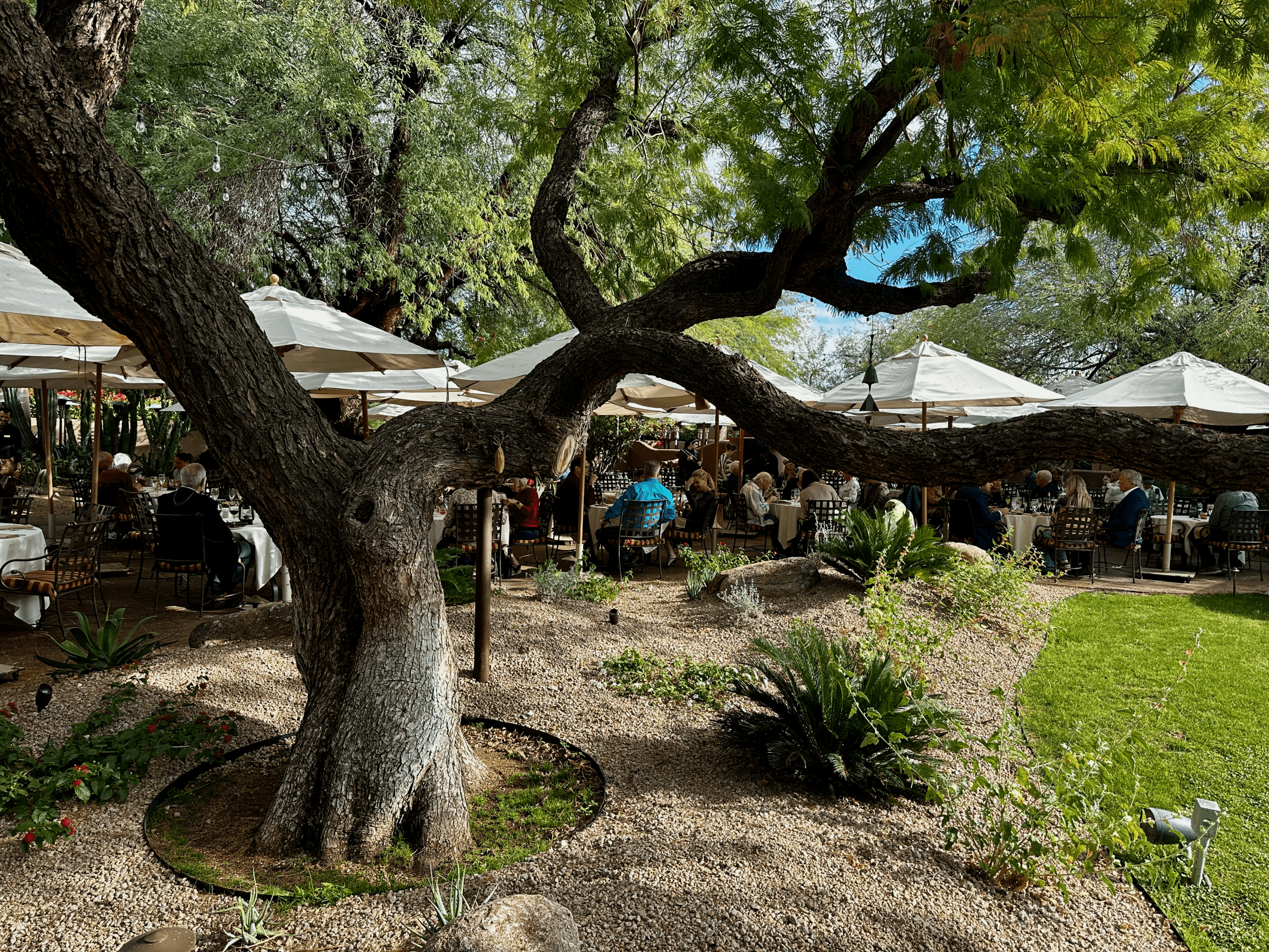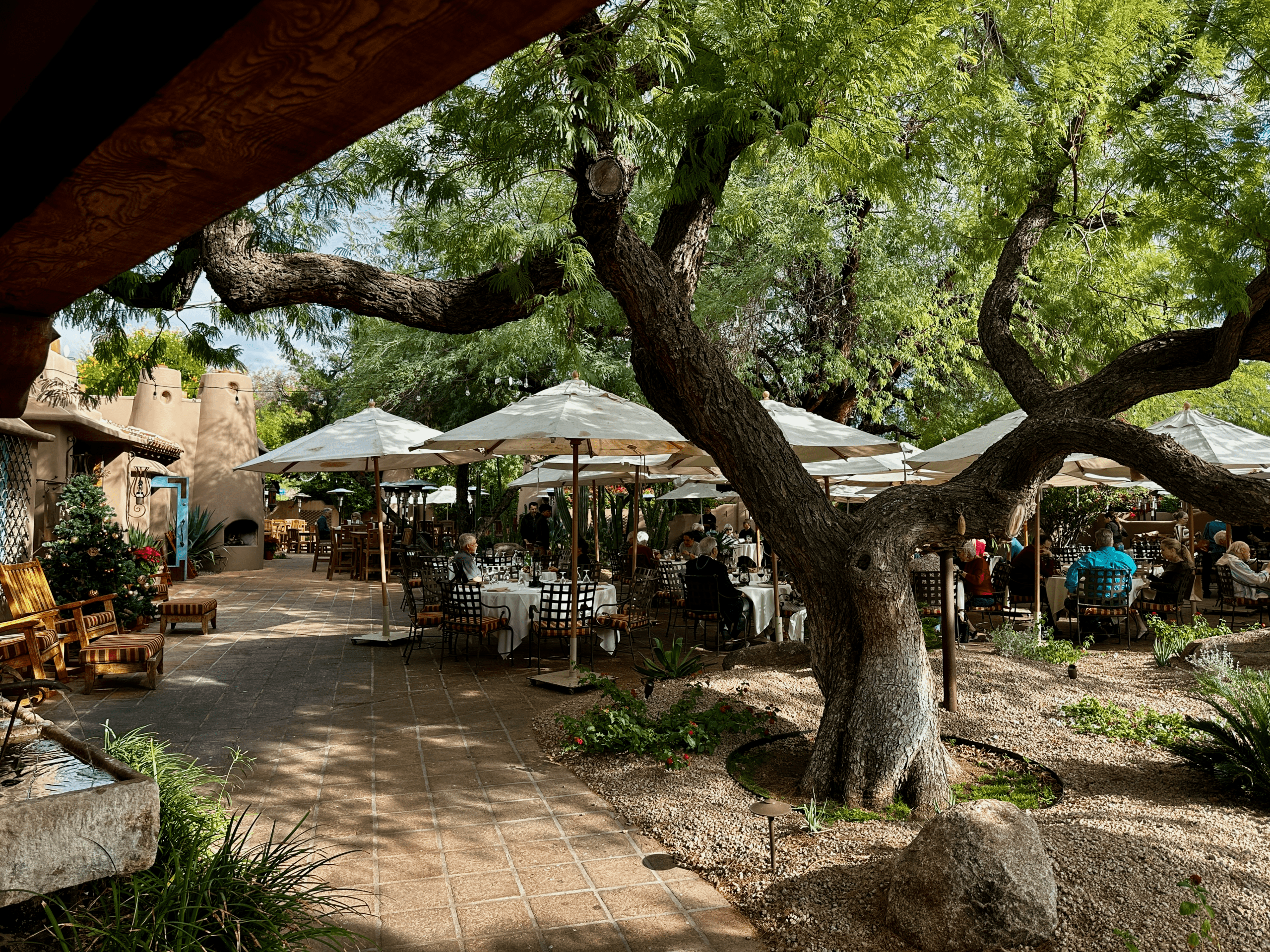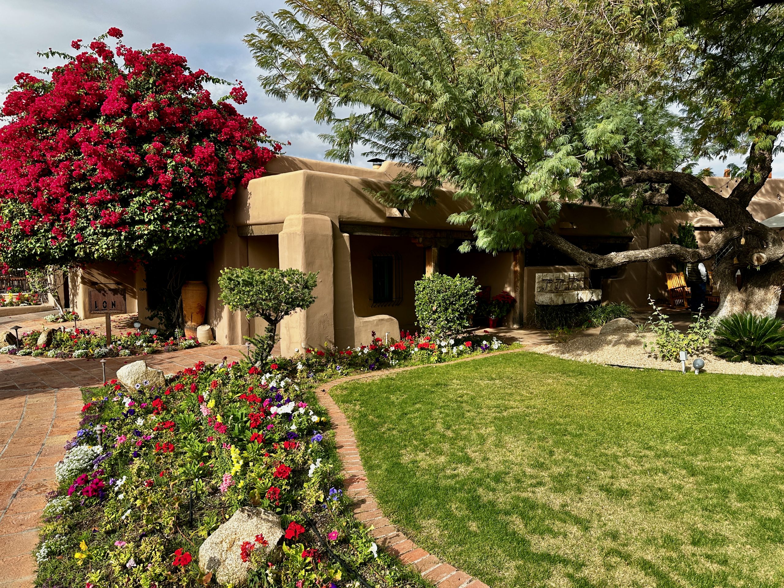 Lon’s at The Hermosa Inn has earned its reputation as one of the most beautiful restaurants in the world–even if you don’t dine in an underground wine cellar. Al fresco dining is the way to go. Thankfully the Valley of The Sun has the weather to accommodate outdoor dining under arboreal splendor. Five with five outdoor fireplaces, a trickling fountain and colorful flowerbeds are the backdrop for your meal. We also had continuous entertainment with our meal. Seated next to the multi-layered fountain, we were entertained by birds either bathing in the water or leering at our meal. Ocassionally one of the feathered fiends would swoop down and abscond with a bit of bread or a packet of sugar. Our server told us he’s done everything he can to shoo away the birds. I suggested he tell them ICE is coming for them.