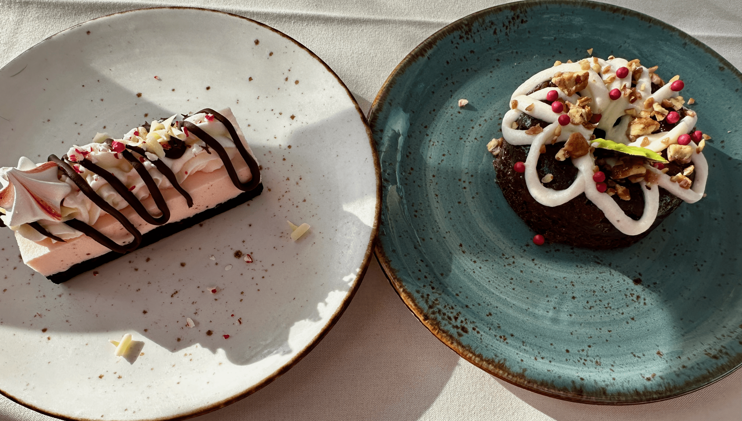 Only two dessert choices were available–Peppermint Mousse Cake and Spice Cake. Winter, for some reason, seems to elicit cravings for the refreshing flavor of peppermint. The peppermint mousse cake didn’t disappoint. A flourless chocolate cake with white chocolate curls, it had the flavor of Christmas–even on a 70-degree Arizona day. For my Kim, the spice cake (cream cheese frosting, candied pecans) hit the spot. Not only was it as beautiful as a Christmas ornament, it was absolutely delicious.