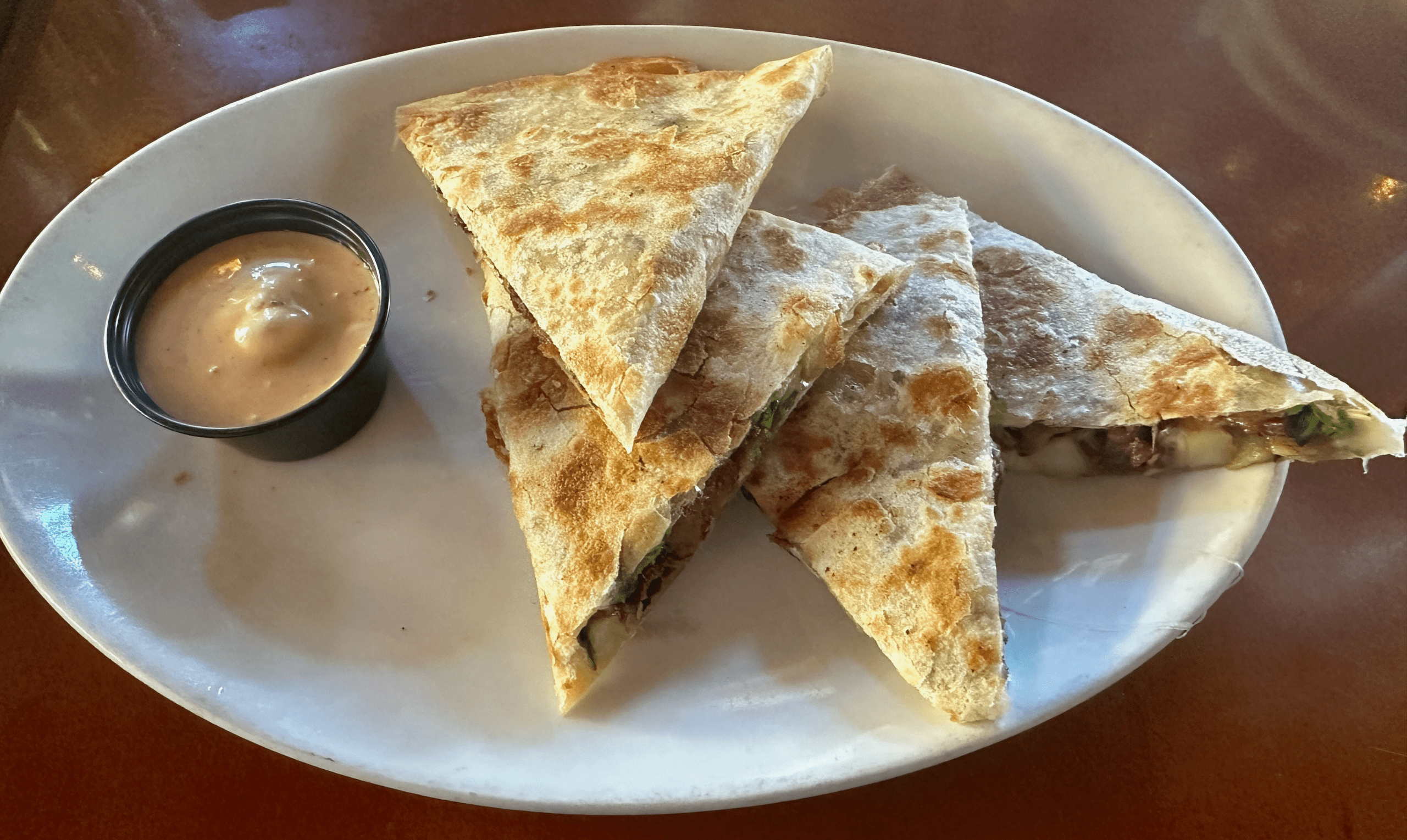 We started our meal with a uniquely named quesadilla called the Tukee Pear Quesadilla. You likely won’t find a “tukee pear” on any comprehensive list of fruits. Tukee pear is thought to be a local name for a prickly pear cactus fruit used within a quesadilla. More precisely, it’s a quesadilla that showcases the sweet, juicy texture of cactus fruit alongside such savory elements as bacon, arugula and pepper jack cheese served with a side of Perfect Pair’s southwest cream sauce. The prickly pear cactus fruit doesn’t have a fruity burst. Instead, its sweet notes are subtle. Not quite as subtle is its crispy texture. The bacon, arugula and pepper jack counterbalance the sweet flavors while the southwest cream sauce lends piquancy even I can respect.