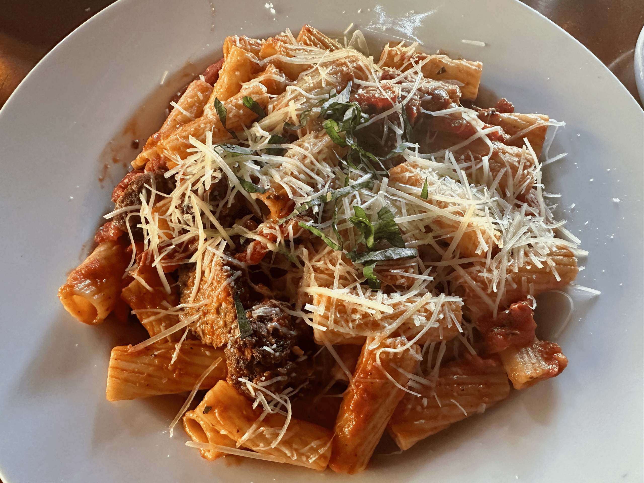 Several years ago, an Italian restaurant in Albuquerque served an amatriciana sauced dish that put to shame many dishes showcasing New Mexico’s sacrosanct chile. It was so piquant that none of the other ingredients were discernible. Amatriciana sauce is named for the municipality of Amatrice, not for anything to do with America. Along with seafood fra diablo, it’s Italy’s contribution to those of us who could lap up lava from Mount Etna. In all honesty, however, I ordered the Rose Amatriciana at Perfect Pear because it’s made with my favorite pasta–rigatoni which doesn’t require manual dexterity like spaghetti does. This dish is made with bacon, caramelized onions, roasted red peppers and the restaurant’s signature creamy spicy red sauce all topped with Parmesan and basil. Instead of one of the available proteins, I had my dish with falafel. What a pleasant surprise that was. This Amatriciana dish didn’t scald my taste buds as the one in Albuquerque did. It was a perfect dish with the falafel pairing wonderfully.