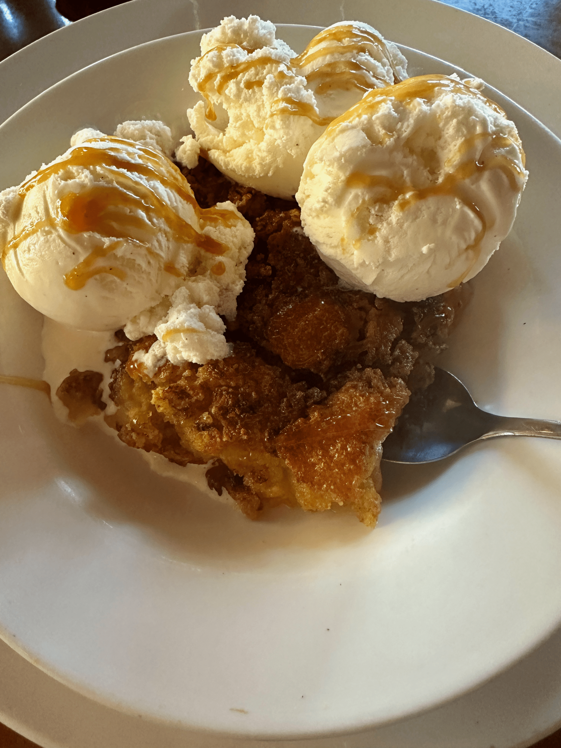 Many a time have I had cobbler at barbecue and Southern restaurants. Most of the time it leaves me with an “is that all there is” reaction. Not so with Perfect Pear’s peach and pear cobbler with three scoops of vanilla bean ice cream. Served warm, the cobbler is practically melt-in-your mouth good. So much flavor, so much deliciousness. Then there’s the vanilla bean ice cream drizzled with caramel. Could there possibly be a better topping for a phenomenal cobbler. Yes, phenomenal. It restored my faith in cobbler.