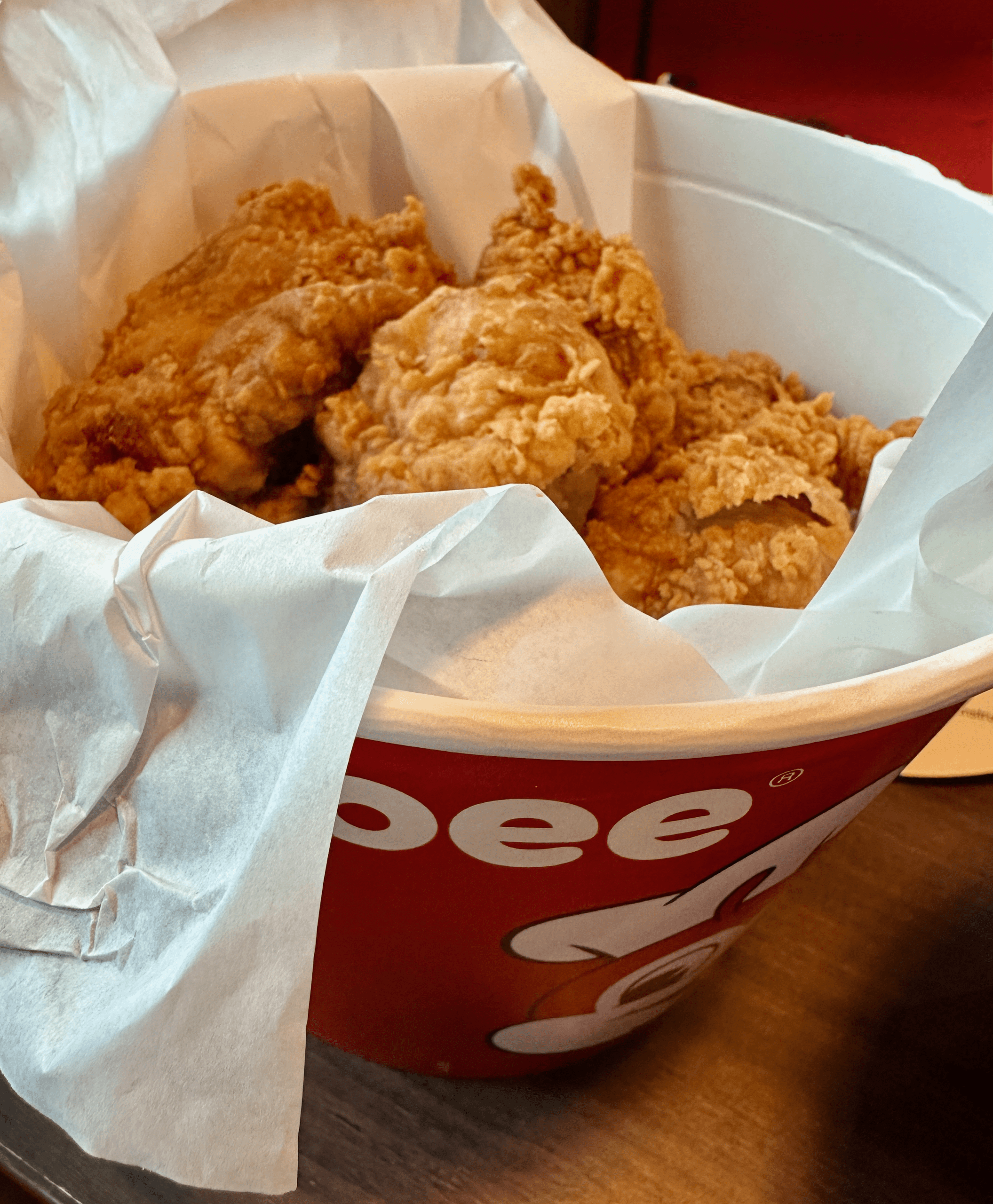 My Kim ordered a six piece “Chickenjoy” bucket. Chickenjoy is apparently the name of Jollibee’s increasingly famous, award-winning fried chicken. About half of the hand-breaded six pieces were legs, but these beauteous Betty Grable quality gams were so meaty and juicy that we couldn’t complain (sorry, Sr. Plata). Two thighs and a breast rounded out my Kim’s six pieces. True to its name, the juicy, crispy fried chicken brought my wife more joy than any burger could have. If you think spaghetti as a side is anomolous, you’ll get a kick out of seeing a generous helping of rich, creamy, and savory brown gravy that serves as a popular accompaniment to many menu items, especially the fried chicken and mashed potatoes. This gravy is known for its distinct umami flavor, often described as having hints of beef and chicken, despite being a side dish for the latter. Unlike some chain restaurant gravy which has the viscosity of peanut butter, this gravy is an easy pour.