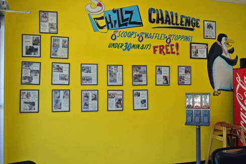 The Chillz Challenge: eight scoops, eight waffles, eight toppings in thirty minutes and your frozen feast is free. You’ll also get your photo prominently displayed on Chillz’ wall of fame, Web site, Facebook and MySpace sites. The current record-holder is Stephanie Torres, a petite dynamo who completed the Chillz Challenge in just over eight minutes. I’m easily twice her size and couldn’t approach her eating feat on my best day.