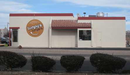 Albuquerque’s first Lumpy’s Burgers was situated in a very familiar location to residents of Albuquerque’s West Mesa area. It was located on Route 66 just west of Central Avenue’s intersection with Old Coors Boulevard and about a mile from one of Albuquerque’s most prominent neon spangled signs, one which celebrates Route 66. Lumpy’s occupied the former home of Taco Phil’s Carry Out, once one of the West side’s most popular New Mexican food destinations. Designed in the 60s as strictly a carry-out enterprise, the building offered seating underneath a canopy that provided a bit of shade for those days of intense Duke City sunshine, but can’t buffet the March winds. On November 18th, 2011, the second Lumpy’s opened its second restaurant near the Cottonwood Mall (10131 Coors Road, N.W.) in a building which last housed an Owl Cafe. It’s a more conventional restaurant with indoor seating. The original Lumpy’s closed shortly thereafter.