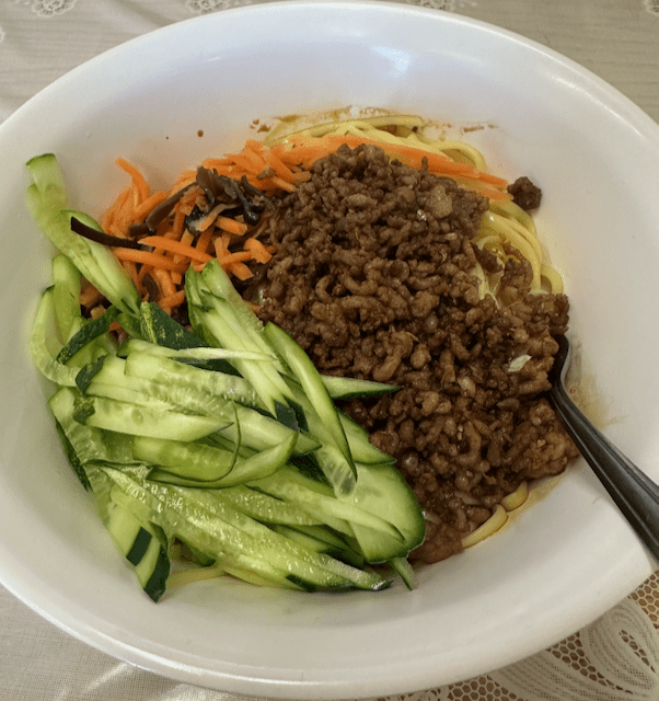 The first of our four entrees to arrive was Dandan Noodles, a Sichuan dish traditionally served by street vendors who carried them on poles across their shoulders (dan dan). This spicy noodle dish is normally tossed in a sauce of chili oil, Sichuan peppercorns and preserved vegetables. The dandan noodles delivered to our table resembled a Vietnamese vermicelli noodle dish in that topping a tangle of noodles were fresh carrots and cucumbers along with ground beef. We didn’t discern any of the numbing Sichuan peppercorns we both love. Nor did our tongues burn beautifully from chilis. The noodles and broth were slurp worthy.