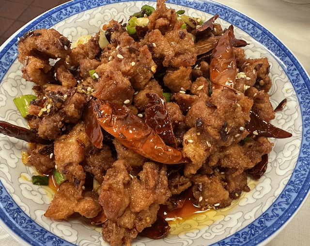 Our final entree was the spicy diced chicken. Spicy was somewhat of a misnomer in that unless we bit down on the incendiary dried chili peppers, we discerned very little heat. In the Sichuan province, this dish is tossed with a profusion of dried red chili peppers, Sichuan peppercorns, ginger, garlic and sesame seeds. It should be a fiery, numbing (mala) dish in which aromatic chilis and spices waft toward happy diners. Though we enjoyed the chicken, we really would have preferred much more personality.