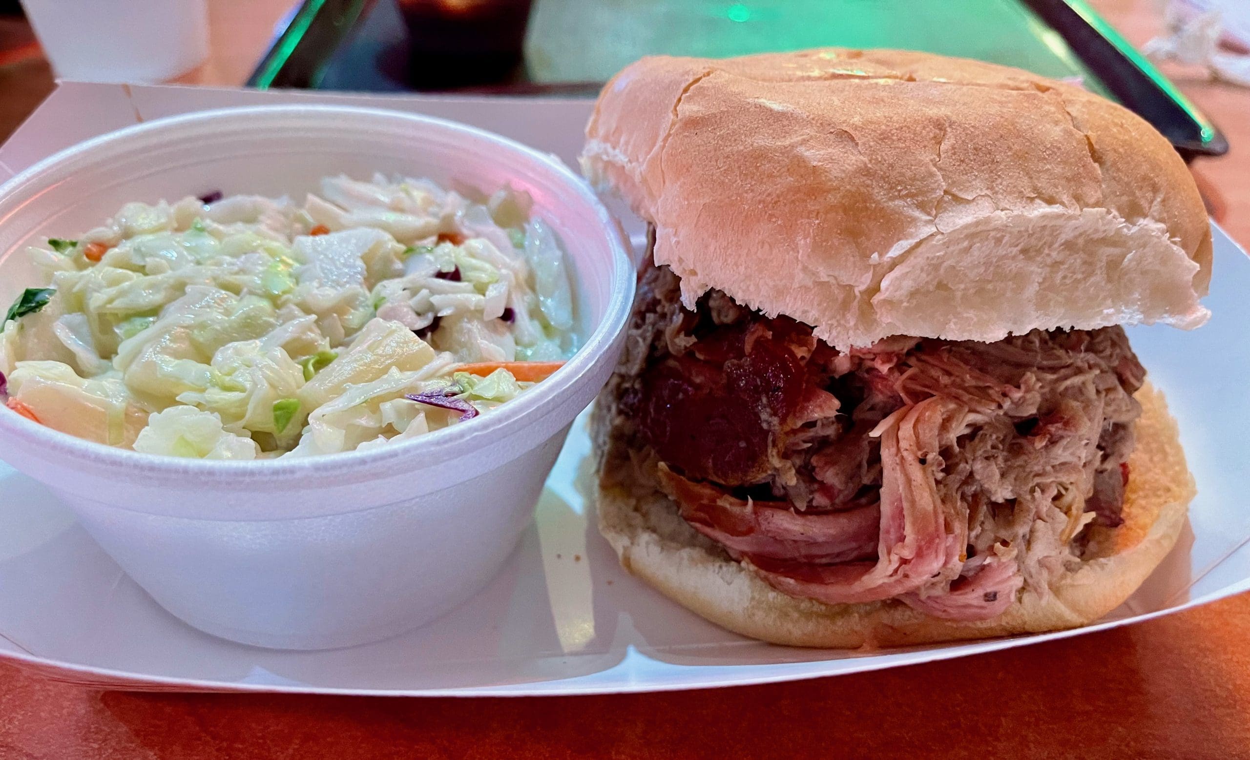 16 September 2022: Despite nearly half her life spent in the Land of Enchantment, my Kim is not a green chile cheeseburger aficionado. Her preference is almost anything else, particularly good barbecue. Among her very favorites is Sparky’s pulled pork sandwich with a side of the pineapple coleslaw. The pulled pork is tender, flavorful, moist and as light as frost. While some so-called barbecue experts can’t seem to infuse much flavor into their pork (and rely on cloying sauces to add that critical component–flavor), Sparky’s pulled pork is absolutely delicious, rich, complex and thoroughly addictive. How good is Sparky’s barbecue? Put it in the same class as the ‘cue at Sugar’s BBQ & Burgers in Embudo. In other words, it’s among the very best barbecue in New Mexico.