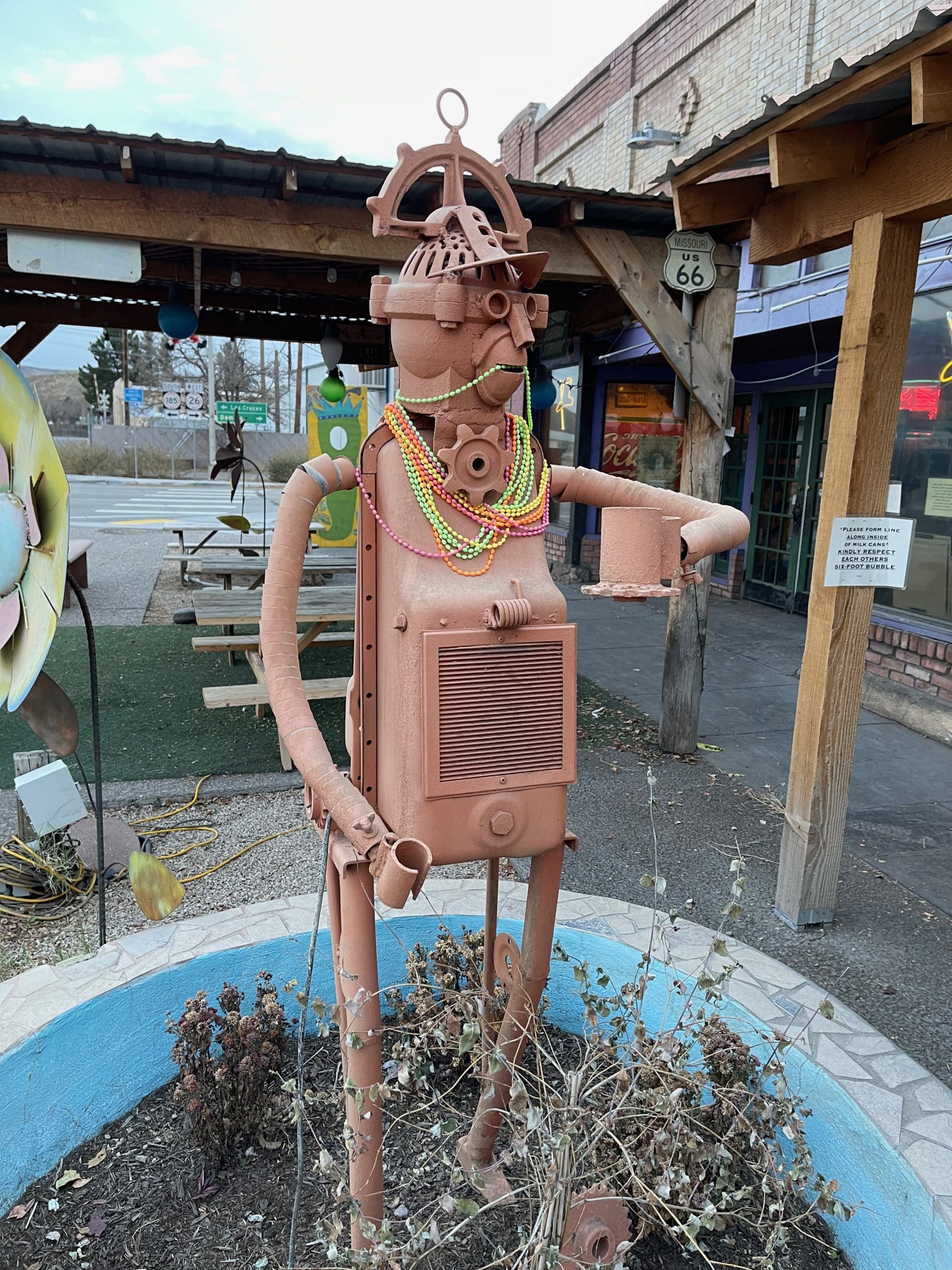 The epicenter of fiberglass statue land appears to be Franciscan RV, about a quarter of a mile in town. A restored Muffler Man is the most prominent and prolific statue. Holding a tiny model of a Winnebago RV in his upturned right hand, Muffler Man easily dwarfs other fiberglass statues in the fenced in complex. He’s much taller than any of the recreation vehicles in the complex, too. The office area holds a veritable museum displaying everything from antique toys to old time jukeboxes and pianos.